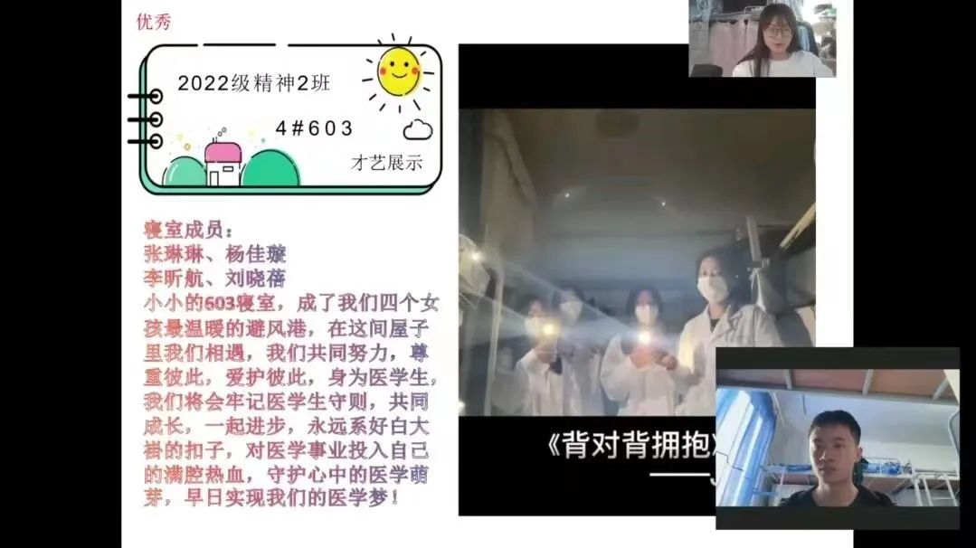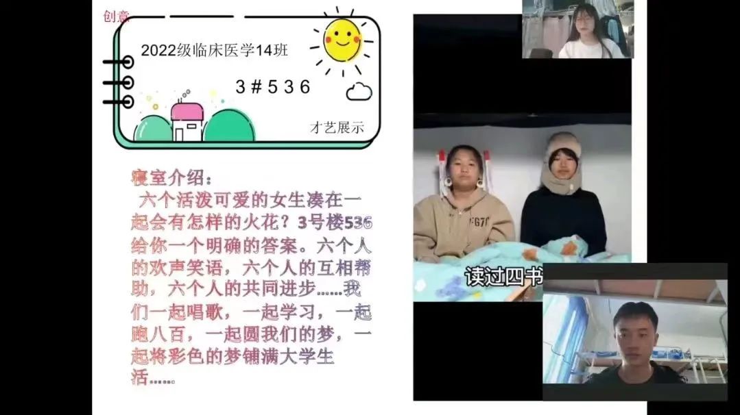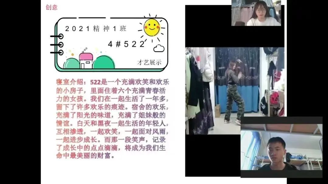 在寝室文化风采展示环节中,同学们纷纷大显身手,积极在视频中记录寝室的日常生活和趣事:初雪记录、运动健身打卡、舞蹈才艺展示……视频剪影间尽显温馨和谐的寝室氛围,帧帧笑颜中彰显欢乐美好的寝室光景,给自己和室友留下了难忘的回忆。