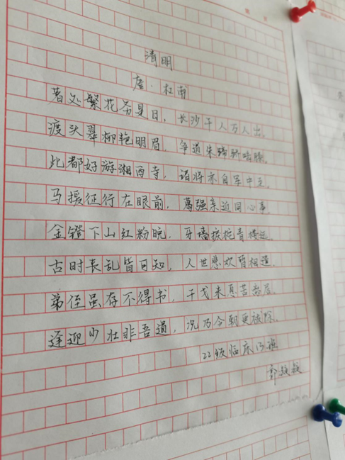 本次活动,基础医学院全体同学踊跃参与,眷写出了一篇篇内容丰富、铿锵有力的诗词作品。2022级医学影像学蒋美名同学的作品字体雄浑,气势磅礴,借毛泽东主席《七律·人民解放军占领南京》一诗描绘了中国人民解放军渡江解放南京的雄伟场面,表达了她对革命先烈的无比敬仰。一首《采桑子·清明上巳西湖好》在2021级临床医学12班袁小涵同学清秀隽永的笔迹下,充分演绎出先人乐观豁达的心境。2022级临床医学13班郭凝凝同学的笔峰苍劲有力,一笔一顿间一首《清明》流露出对传统节日文化的热爱。