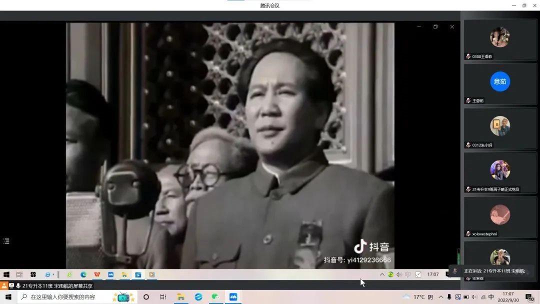 从中国共产党的成立到新中国的诞生,再到如今中华民族屹立于世界民族之林,中国共产党经过百年奋斗与求索,才开拓出了如今的盛世太平。“起来!不愿做奴隶的人们......”伴着雄壮激昂的义勇军进行曲,分散在祖国各地的同学们都纷纷唱起了国歌,活动正式开始。随后进行活动第二项,重温入党誓词。“我志愿加入中国共产党,拥护党的纲领,遵守党的章程......”全体党员面向鲜艳的党旗,举起右拳,重温入党誓词。铿锵的誓词,坚定的承诺,表达了党员们为党和人民奋斗终身的决心,让在场的党员心潮澎湃,更加坚定了初心不改、继续奋斗的信念。活动最后,全体党员观看《开国大典》纪录片,回想起我们中华民族经历的沧桑岁月,每个人的内心都充满了对革命先烈的崇敬与对新中国成立来之不易的感动。没有共产党就没有新中国,没有新中国便没有现在的幸福生活。