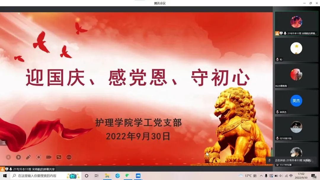 金秋十月秋风爽,花团锦簇国庆来。国庆期间,为激发吾辈对党和国家的热爱和感恩之情,从党的非凡奋斗历程中获得启迪,护理学院学工党支部开展以“迎国庆、感党恩、守初心”为主题的党日活动,全体学生党员参加此次活动。
