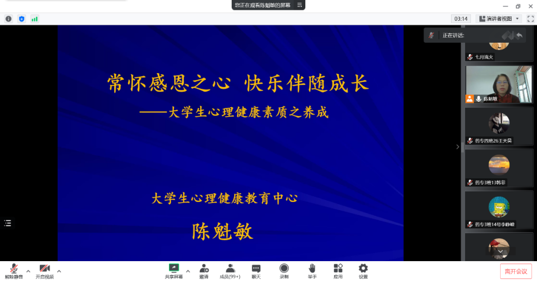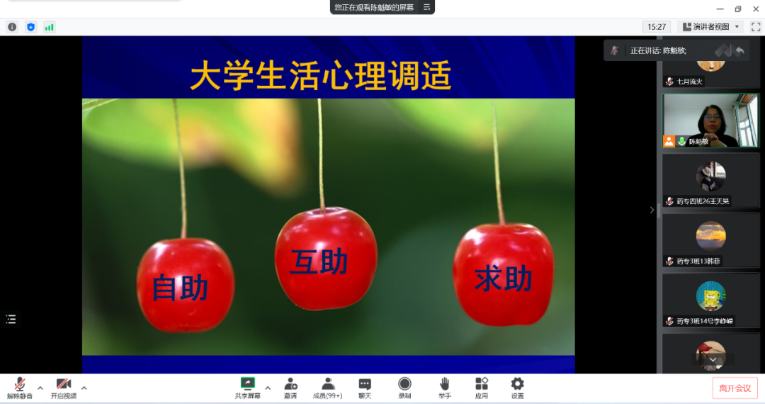 为帮助新生提高心理调节能力,尽快适应大学生活,9月30日,药学院组织开展了新生线上入学教育第八讲——大学生心理健康教育,邀请了大学生心理健康教育中心陈魁敏老师,为大家上了一堂生动的心理健康教育课。
