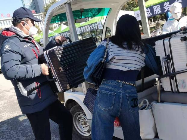 在老师及学生志愿者的帮助下,一袋袋行李相继被搬运至宿舍楼。天气虽冷,但志愿者的脸上满是汗水,纵然湿了衣衫,却没有一个人喊累,更没有停下脚步。他们穿梭在楼舍间的楼梯上,往返在校园路上,寒冷的天气并未消磨他们的热情,紧提着行李的双手,都是他们甘于奉献的写照。