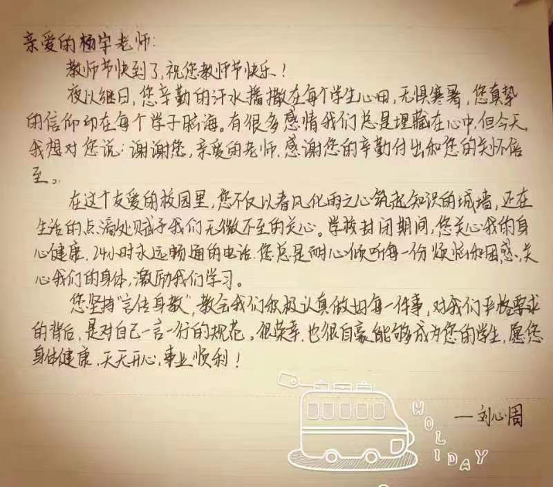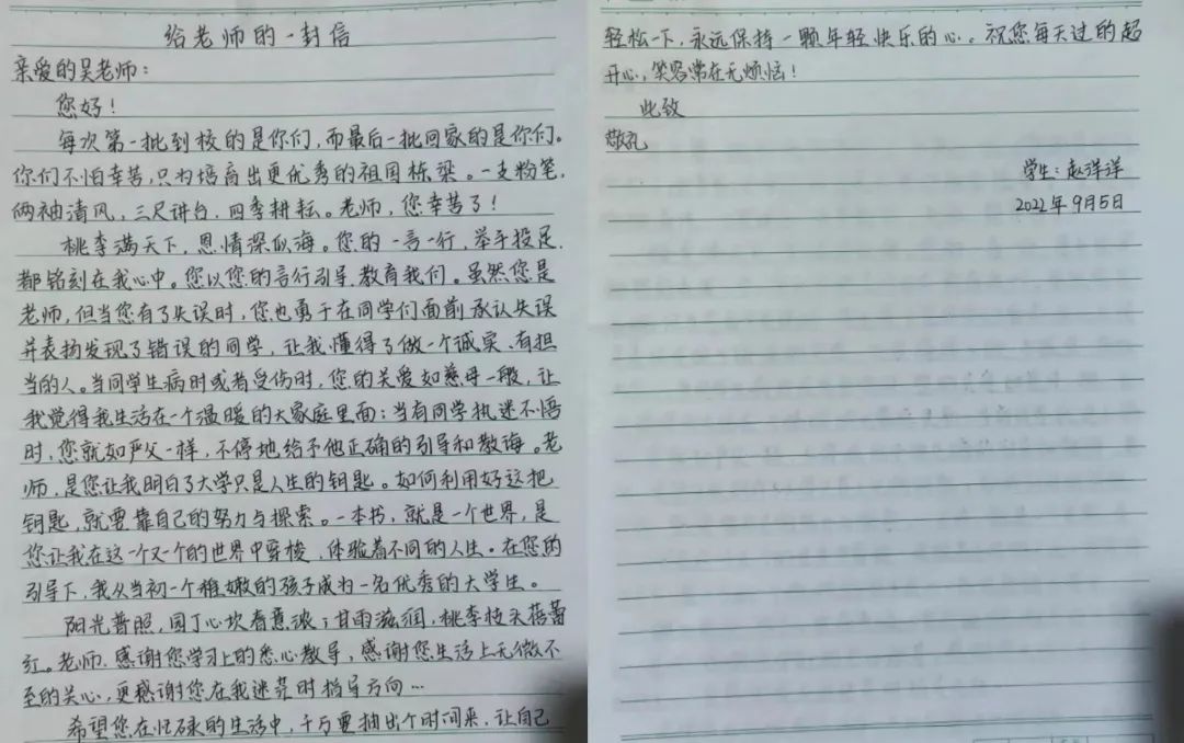 虽然受疫情影响同学们暂未返校,但老师们一直以来的线上陪伴使同学们感受到了校园的氛围。为了向辛勤工作的老师们表达感激之情并送上节日的祝福,同学们用一封封书信书写着对老师们的心意,真挚的言语记录着自己在老师的培育下成长的点点滴滴。