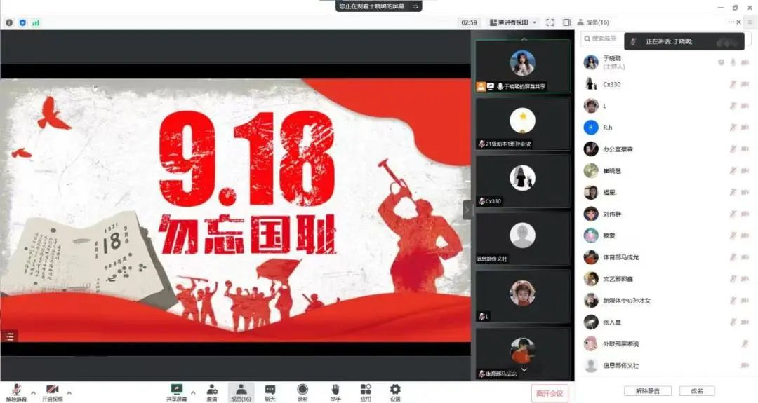 为纪念“九一八”事变91周年,铭记历史,缅怀先烈,大力弘扬以爱国主义为核心的民族精神,9月18日,护理学院通过腾讯会议开展了以“纪念九一八,弘扬民族魂”为主题的演讲活动,学生会各负责人参加了本次活动。