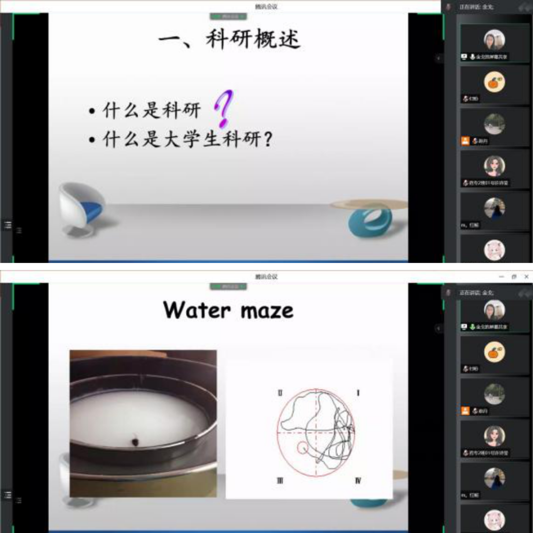 金戈副院长从什么是大学生科研、科研设计内容、研究设计的作用、科研选题原则等方面为大家进行了讲解。其中,她生动形象地讲解了行为学实验,让同学们对实验有了初步了解,也大大激发了同学们的兴趣。此外,她还通过列举大一期间要做好的几件事,来帮助同学们更好地确立学习的目标和方向。