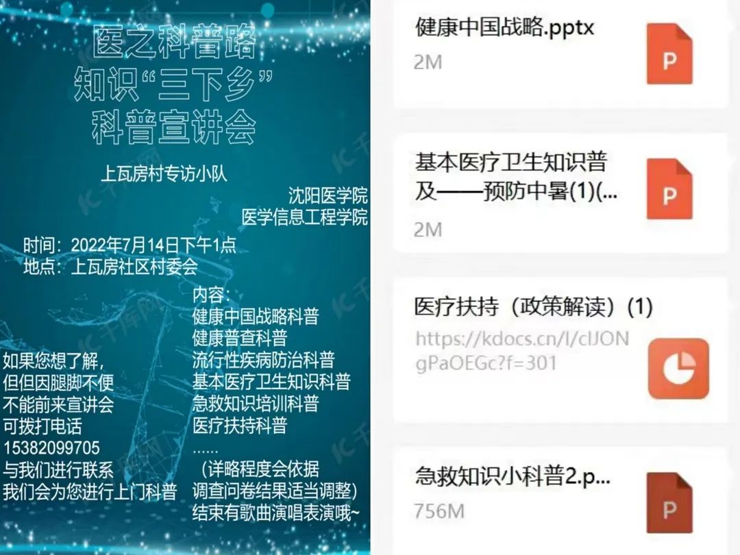 为贯彻落实习近平新时代中国特色社会主义思想,围绕健康中国战略,米兰milan官方网站医学信息工程学院“医之科普路 知识‘三下乡’”社会实践队来到沈阳市苏家屯区,通过开展2022年暑期“三下乡”活动,走访上瓦房村村委会并采访村民,以问卷调查、随机走访、知识科普、线下演讲等多种形式,进行健康普查、流行性疾病防治、基本医疗卫生知识普及、急救知识培训等,助力乡村医疗卫生事业的建设及发展。