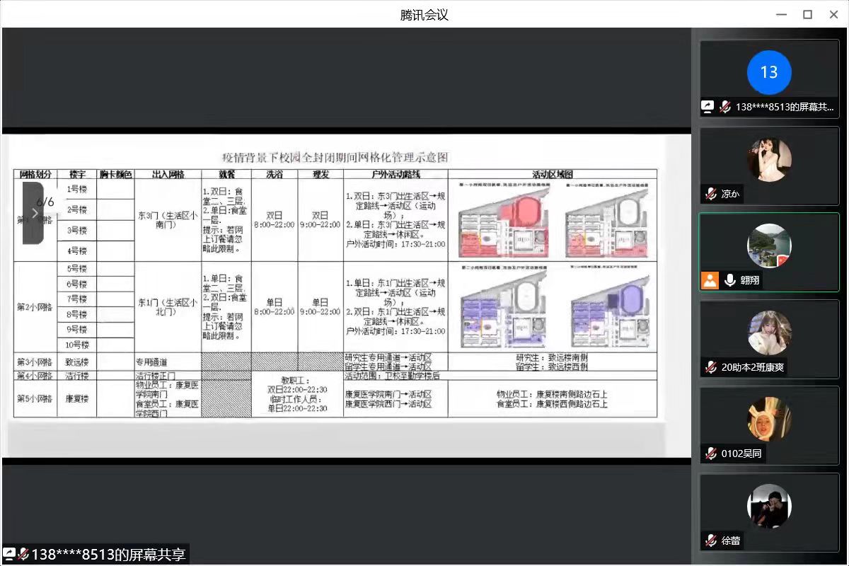 会上,张蕊科长说明了校园网格化管理的目的、意义以及具体管理措施,强调要重点加强学生思想政治教育和正面引导,使全体辅导员熟悉并认真落实学校网格化管理方案。接下来,各年级辅导员分别召开了线上主题班会,传达宣传网格化管理方案,和同学们讲解网格化管理的重要性以及错时错峰、分区分层等相关内容和要求,同时建立了师生反馈机制,设立班级信息员,畅通信息反馈渠道,及时听取学生的意见和建议。