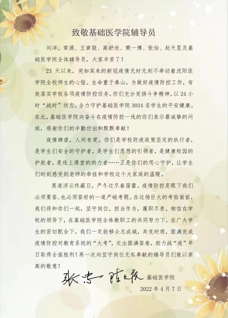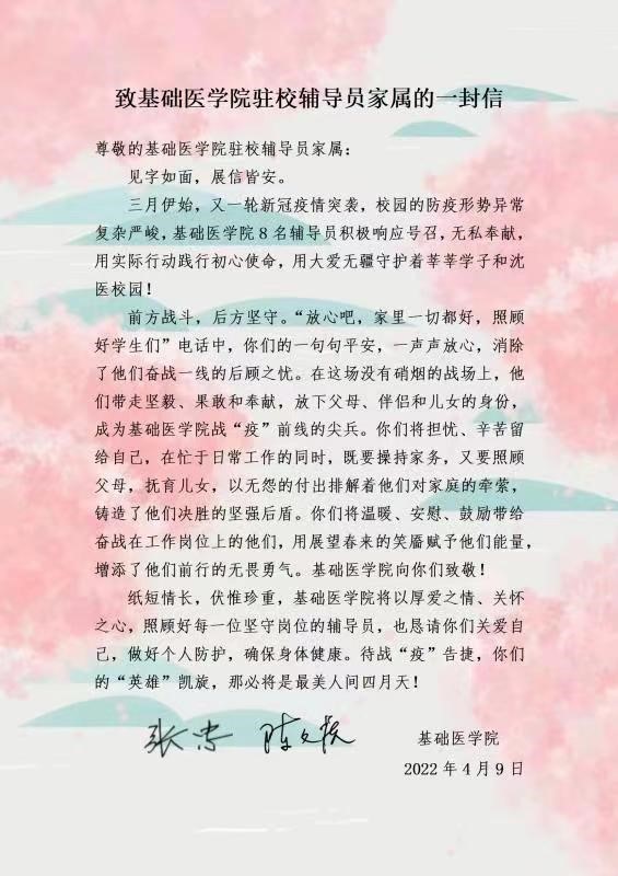 近日,基础医学院向学院辅导员及驻校辅导员家属致信,充分肯定了新一轮新冠疫情爆发以来,学院辅导员尽职尽责、无私奉献,充分发扬斗争精神,为守护基础医学院3034名学生的平安健康发挥的积极作用,同时,对于驻校辅导员家属背后的默默付出,表达了衷心的感谢。