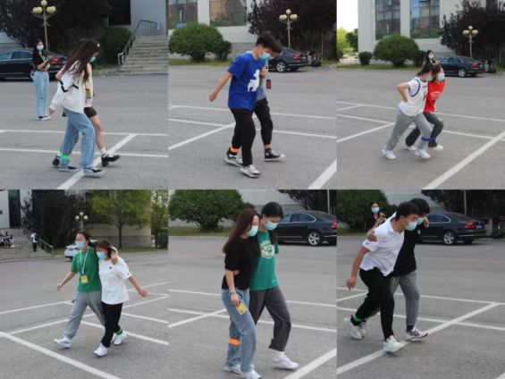 随着哨声响起,参赛者们努力向前冲,激动人心的“两人三足”活动如火如荼地进行着。手搭着肩,节奏一致,考验的是同学们之间的默契。协调的步伐,相近的步速,方可获得胜利。大家你追我赶,奋力向前,毫不示弱,迈着矫健的步伐,向终点飞奔而去。有的同学摔倒了,不怕,互相搀扶着站起;输了,不怕,相互鼓励继续努力。同学们的呐喊声、加油声此起彼伏,拼搏的画面定格在每一名同学的心里,体现了当代大学生的集体荣誉感和团队合作精神。
