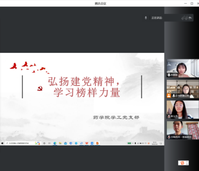 药学院学工党支部于7月6日组织全体党员通过腾讯会议开展“弘扬建党精神 学习榜样力量”主题党日活动,组织学生党员重温习近平总书记在庆祝中国共产党成立100周年大会上的重要讲话精神,跟进学习习近平总书记在中共中央政治局第四十次集体学习,在四川、湖北武汉考察,以及在庆祝香港回归祖国25周年大会暨香港特别行政区第六届政府就职典礼上的重要讲话精神,教育引导广大党员弘扬伟大建党精神,将学习成效转化为推动新时代沈阳全面振兴全方位振兴实现新突破,努力建设国家中心城市的强劲动力。