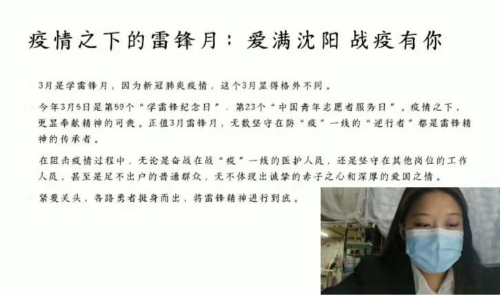 本次活动主要以线上视频讲解的方式开展。青年志愿者利用所学的专业知识,宣传了各种疾病的防护和护理知识。每一个视频都各具特色,有的同学对中西医学有着深刻的认识,倡导对身体无害的自然疗法;有的同学着眼于各种疑难杂症,对乙肝、癌症等疾病提出了自己独到的见解;志愿者充分发挥自身所学专业的长处,带领同学们更好地了解有关“猝死”和“高血压”等疾病的相关理论知识。除宣讲相关疾病以外,青年志愿者还结合当前疫情形式,为大家讲解了“日常消毒措施”;还有的以“疫情之下的雷锋月:爱满沈阳,战疫有你”为主题展开了系列宣传。大家用新的健康理念,使同学们更清醒地认识到学习各类知识的重要性,引导我们更明确地去做好自己生命中的主人。