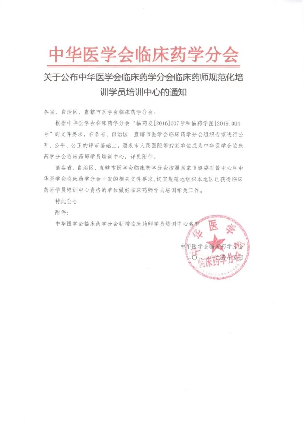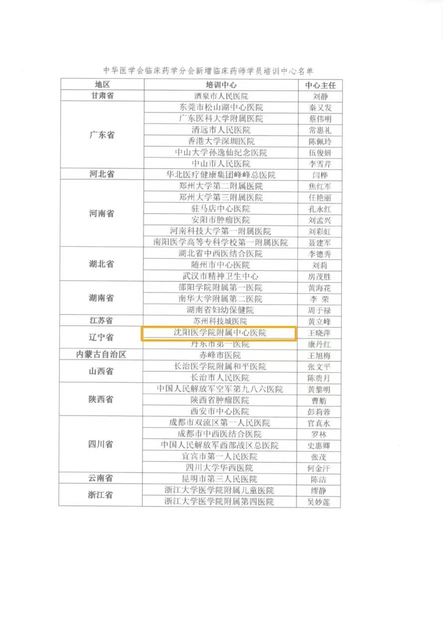 6月15日,中华医学会临床药学分会公布中华医学会临床药学分会临床药师学员培训中心名单,沈医附属中心医院榜上有名!在医院药剂科等相关部门通力配合和不懈努力下,经过辽宁省医学会临床药学分会专家公开、公平、公正的评审,顺利成为中华医学会临床药学分会临床药师学员培训中心。