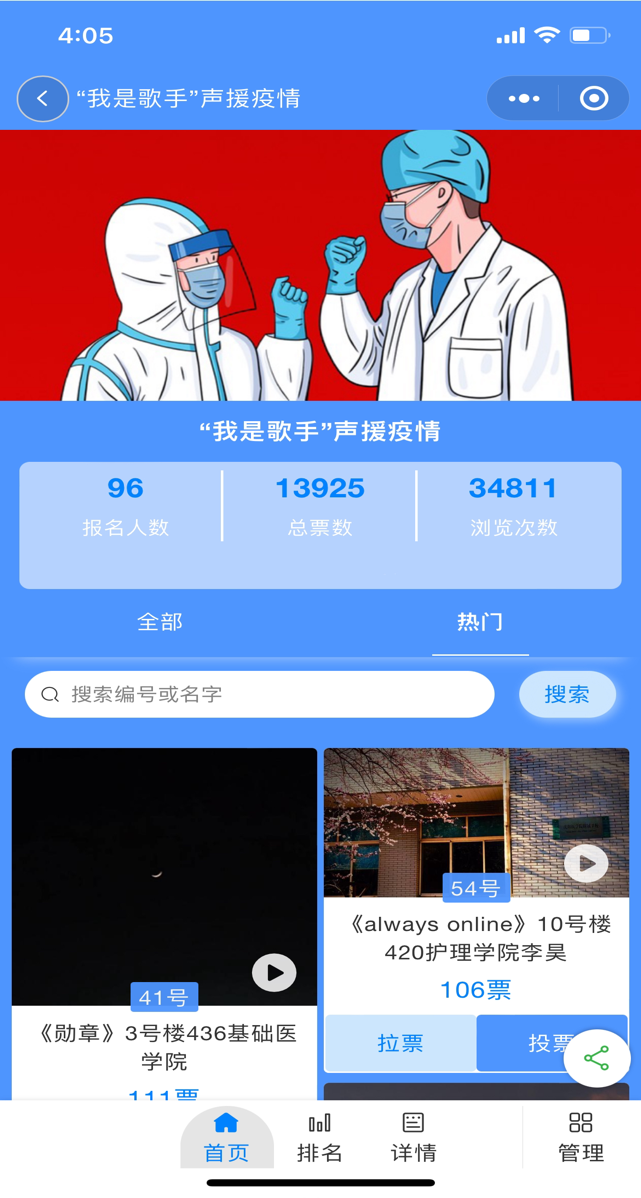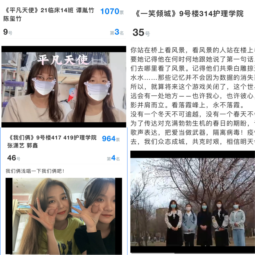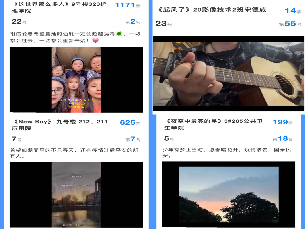 4月6日活动启动后,吸引了各学院同学踊跃报名。同学们上传K歌视频至投票小程序,经审核通过后开始进行网上投票,同学们将视频分享到朋友圈等社交平台。一方面,通过本次活动声援疫情;另一方面,展现当代大学生积极的精神风貌。