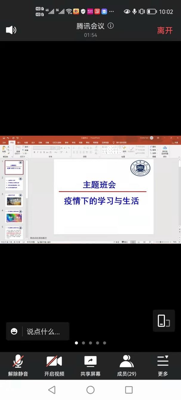 会上,班导师就“我们都是战‘疫’的一份子”“认真学好专业课”“尽早做好职业规划”“谈谈理想与目标”等四个部分与同学们进行了沟通、交流。