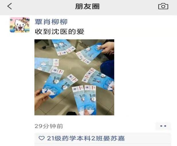 近日,同学们的朋友圈纷纷刷屏:“沈医给力”“咱们的学校到位!”“学校对我们的关心——温暖”等等,内容都是同学们在收到口罩和用餐券后对沈医的感激与赞美。