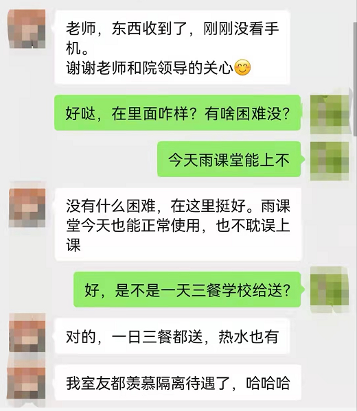 正在隔离的同学这样说道:“我们每天都能收到来自老师和同学们的关心,还为我们送来了‘爱心大礼包’,以满足我们日常生活所需。这‘隔离待遇’让我们室友都“羡慕”了。学校、老师、同学们对我们的关心和照顾,真的让我们非常感动。我们一定会严格遵守学校各项防疫措施,齐心防疫,共克时艰!”