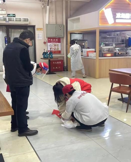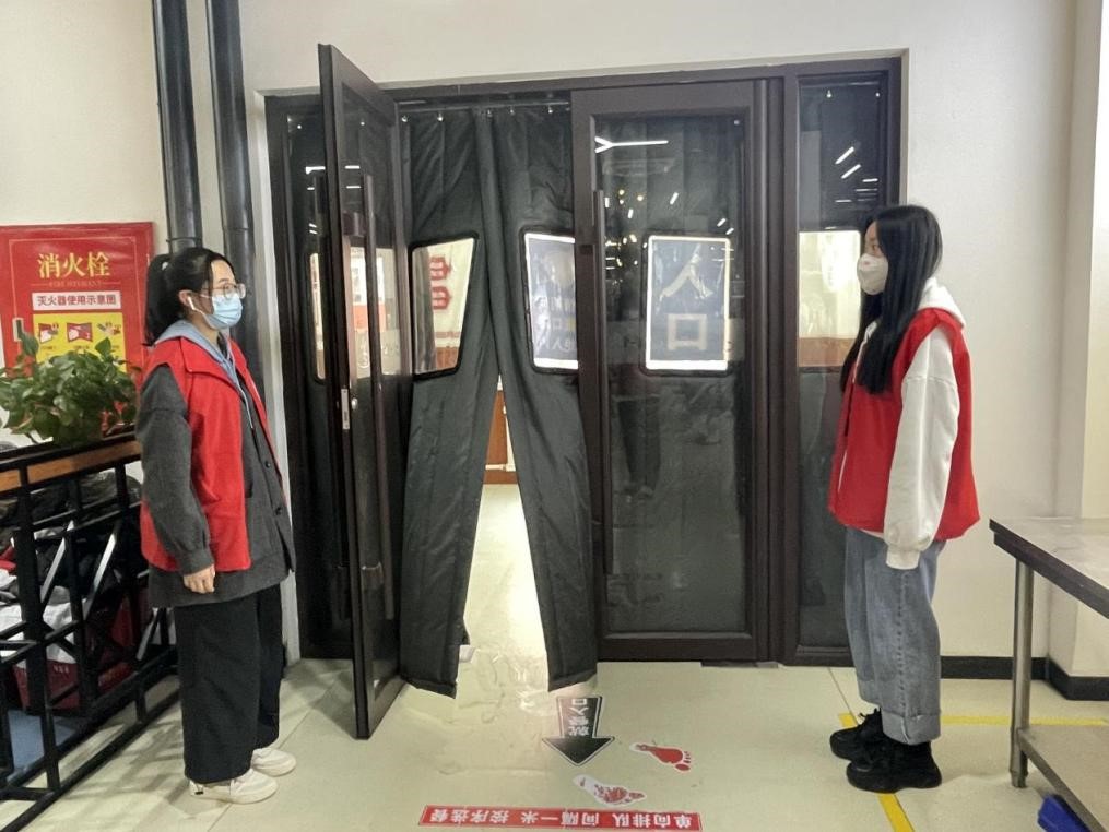 44名志愿者覆盖食堂的一到三层,无论你从北门、正门进,还是在食堂内买饭,都能看到他们的身影;当你从南门准备回到温暖的寝室时,仍旧可以见到他们的笑颜。“配戴好口罩”“出口在南门”,他们一遍一遍提醒着,以最饱满的热情服务着校园内7000余名在校生,让每一个沈医人在封闭的校园内感受到温暖和安全感。校园内的同学们感叹:“这道红色的风景线带给我们无数的安全感和温暖!”