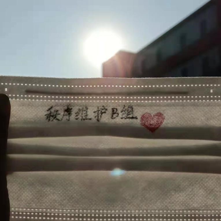 写着“校园秩序维护组-B组”的“特色”口罩是他们独有的风景。这道红色的风景线将持续168小时。志愿者张同学说:“志愿虽苦,但看到同学们安心的笑容,听到同学们开怀大笑,我就觉得很值。青春韶华,本该如此。”“青春如朝日,如百卉之萌动,如利刃之新发于硎”,药学院学子展示出了新时代青年该有之担当。