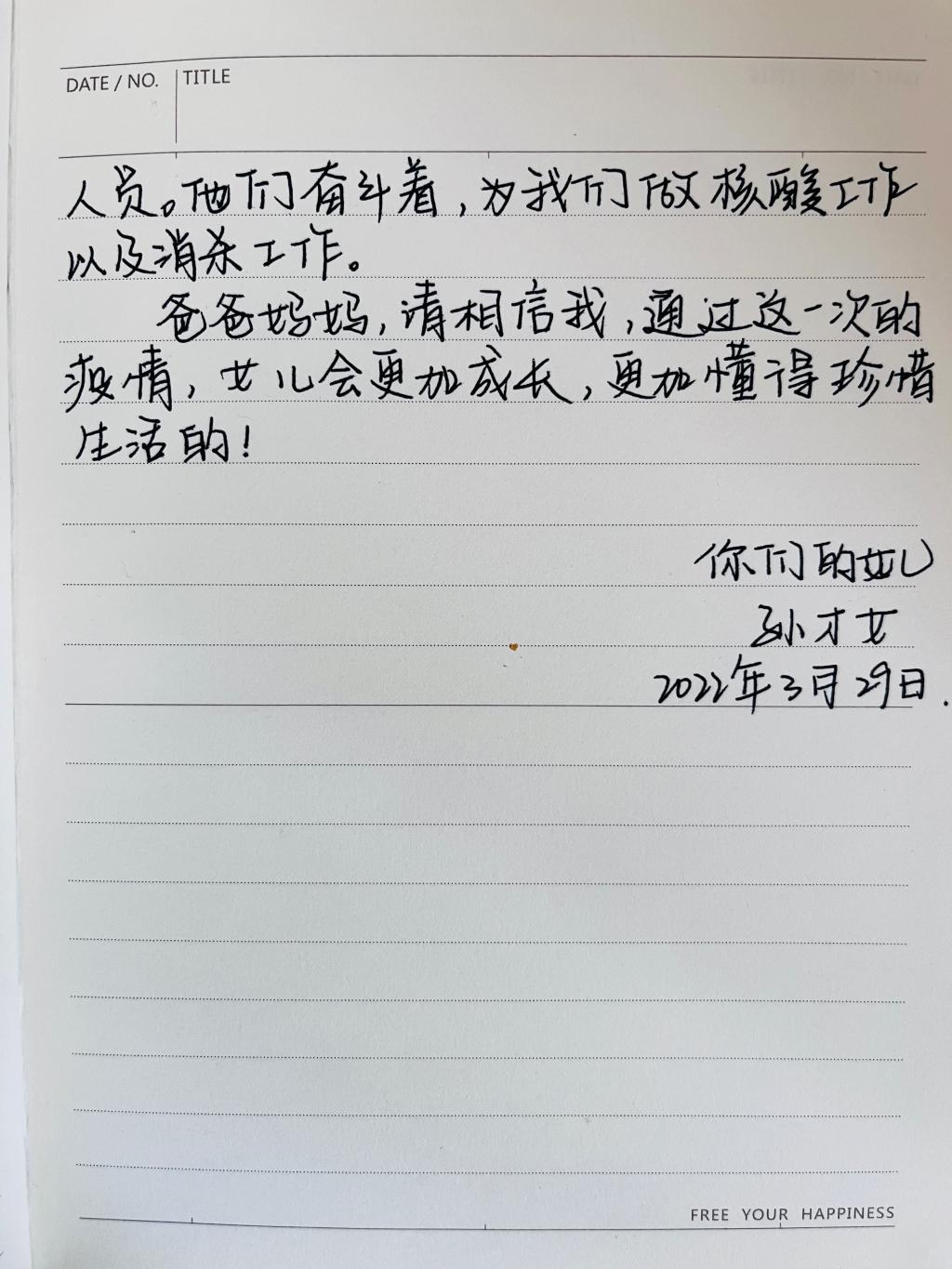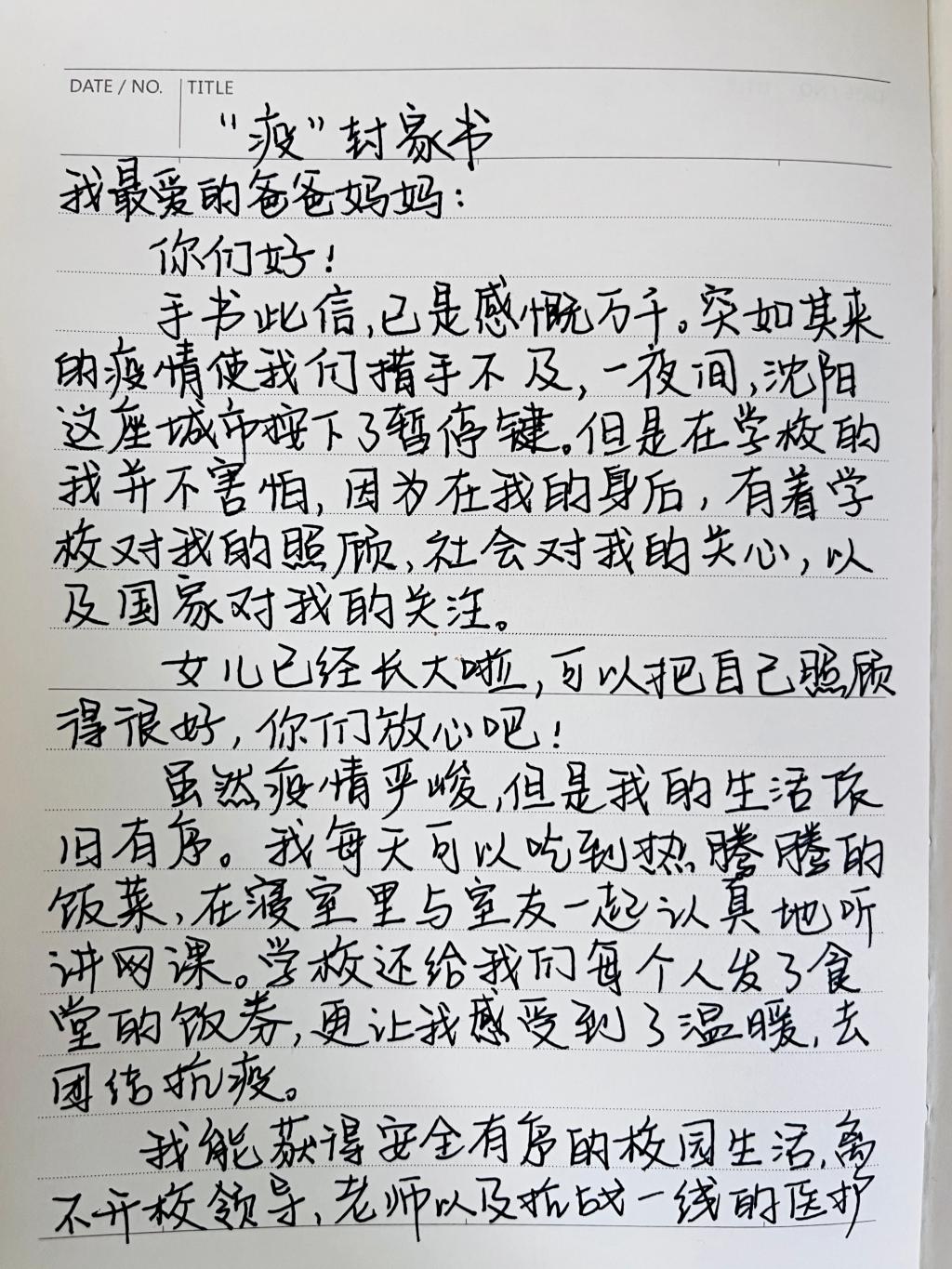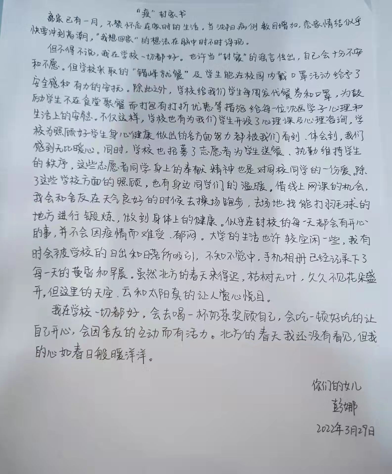 同学们通过线上家书的形式“云”寄平安,在信中,同学们从学校疫情防控的各项举措、日常线上学习情况、生活饮食、开展的心理健康教育等方面,向家长详细地介绍了自己在校的情况,让家人放心,字里行间流露着温馨。彭娜同学写到:“学校采取的错峰就餐及在校园内戴口罩的举措给了我十足的安全感,除此之外,学校每周都会给我们发放口罩和食堂代餐劵,还招募志愿者守护校园平安,感受到了学校各方面的照顾,让我们在沈医也感受到了家的温暖”。