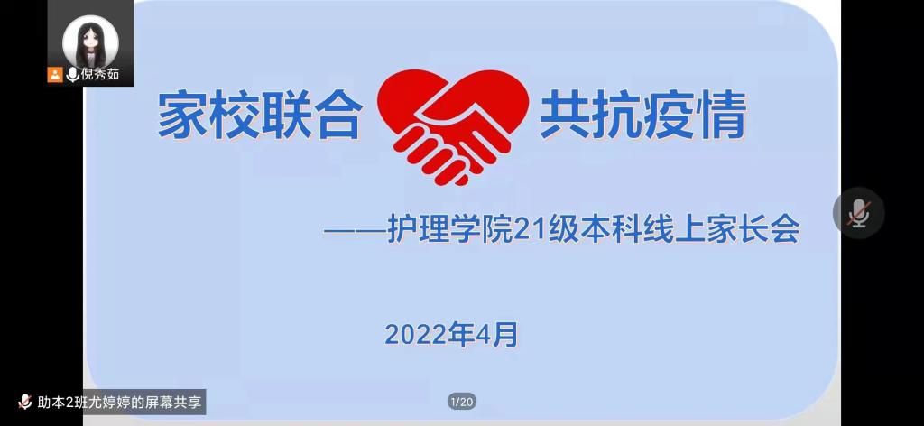 自校园封闭管理以来,学生们在校园里学习和生活的状态时刻牵动着每位家长的心。为了更好地实现家校联合共同抗疫的局面,使家长了解学生在校的情况,和家长共育学生成长,近日,护理学院各专业辅导员分别召开了一场“云端”家长会。