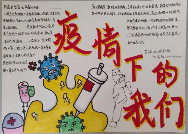 为进一步活跃校园文化生活,增强同学的疫情防控意识,弘扬爱国主义精神,传递正能量,药学院学工党支部于3月28日—4月5日组织了主题为“众志成城,‘画’解疫情”的绘画活动。