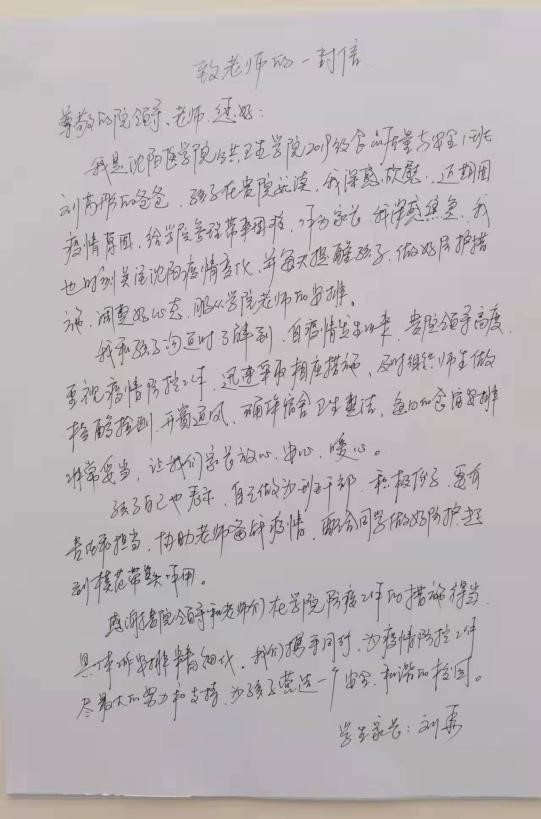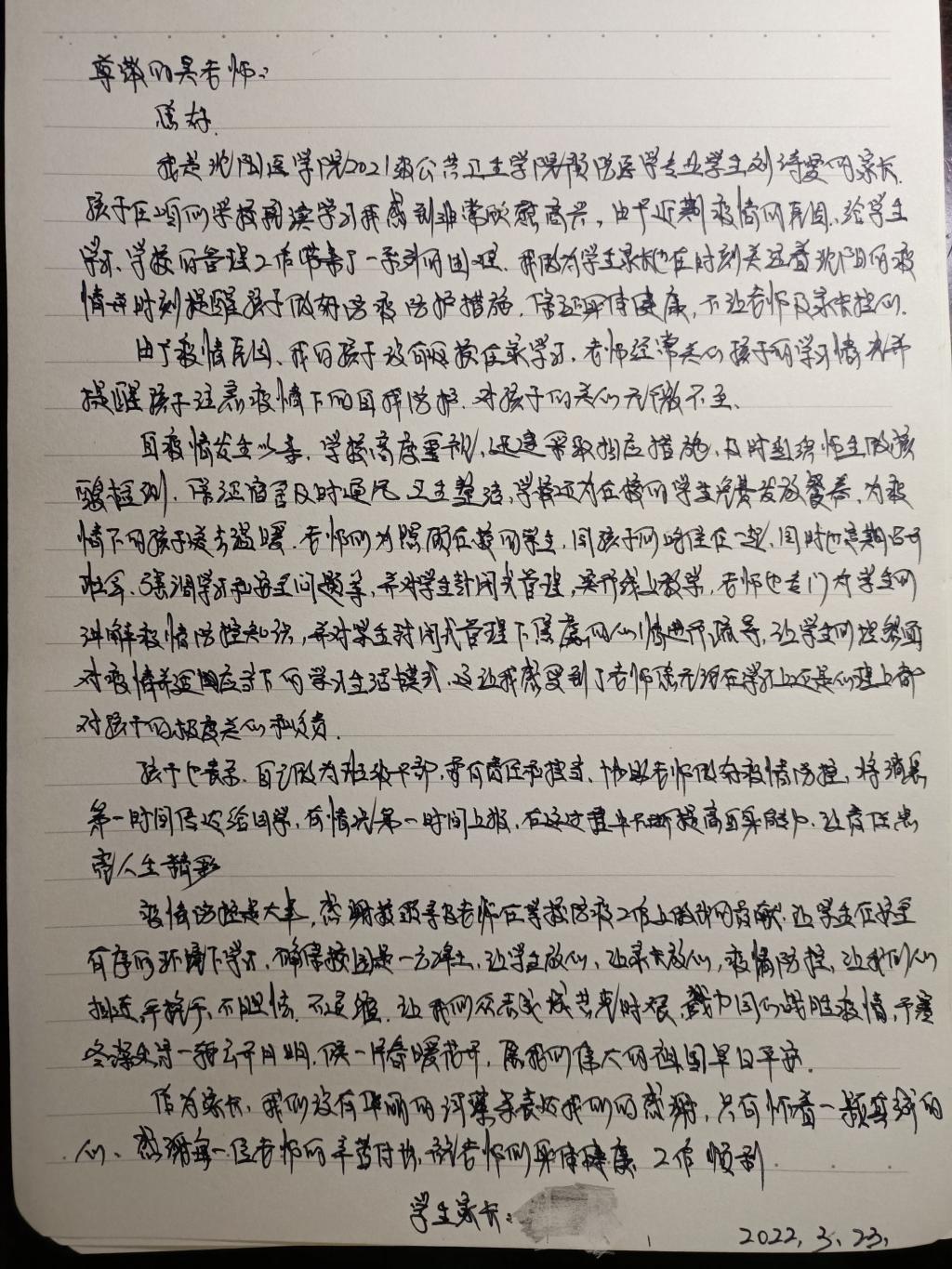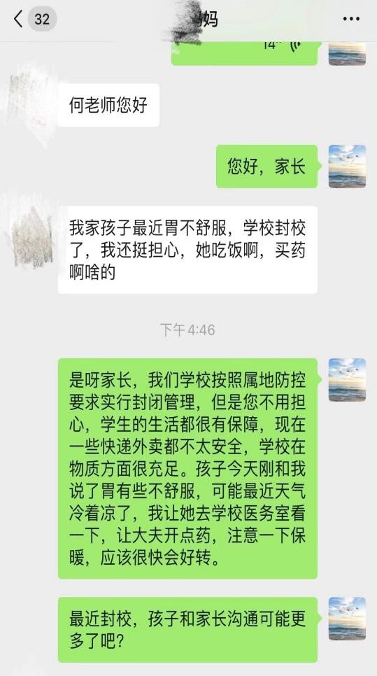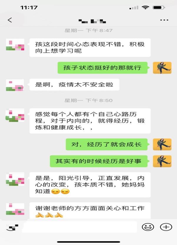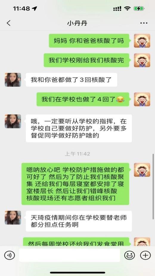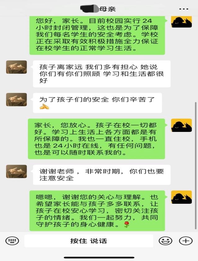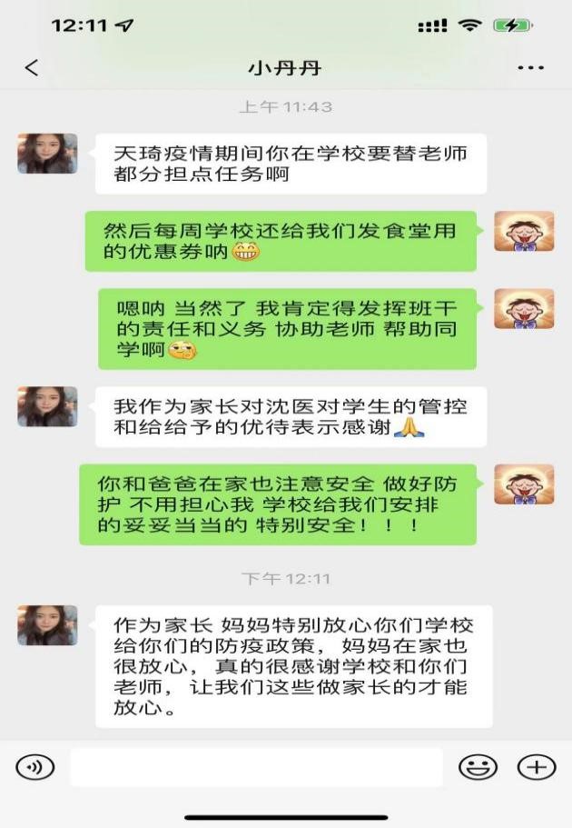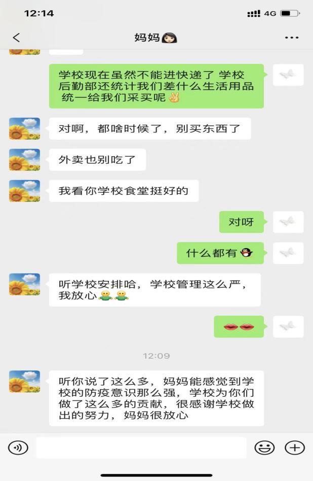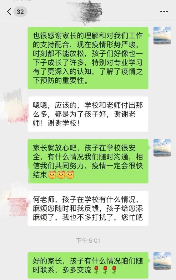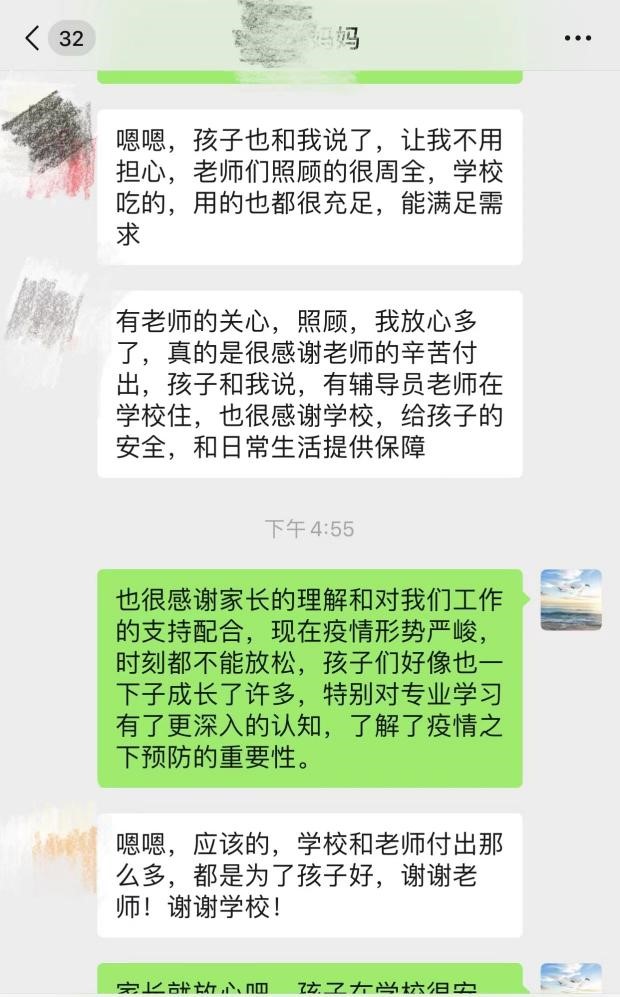 为了解除家长对孩子们的牵挂,辅导员在将疫情防控工作精准细致、扎实落实的同时,积极与学生家长沟通,反馈相关防控政策要求,以及学校采取的各项保障学生平安健康、正常生活的举措,极大缓解了家长们不能与孩子见面所产生的忧虑。同时,在辅导员与家长沟通的过程中也收到了家长对辅导员、对学校疫情防控工作的理解和大力支持。