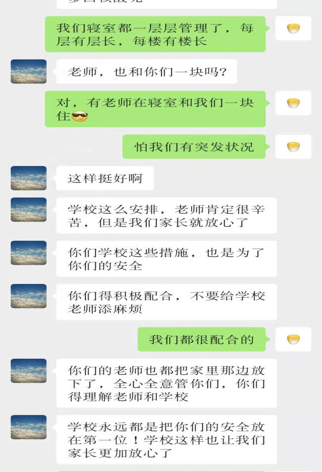 在这场疫情防控战役中,学生与家长被阻隔在了家校两端,但校园保障工作的扎实推进,既保证了学生的健康、平安,又使得家长放心、安心,进一步增强了家校合作,全力为疫情防控期间学生的身心健康保驾护航。相信家校合力抗击疫情,不久我们将迎来跨越山海与家人重聚的日子。我们共同期待,并共同为之努力。