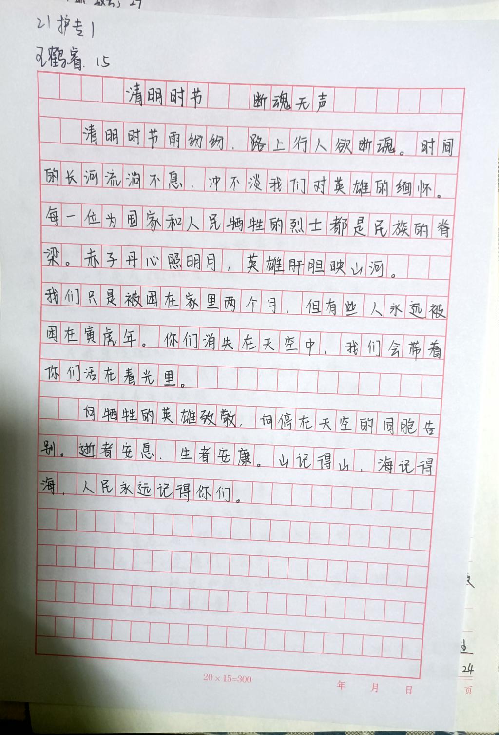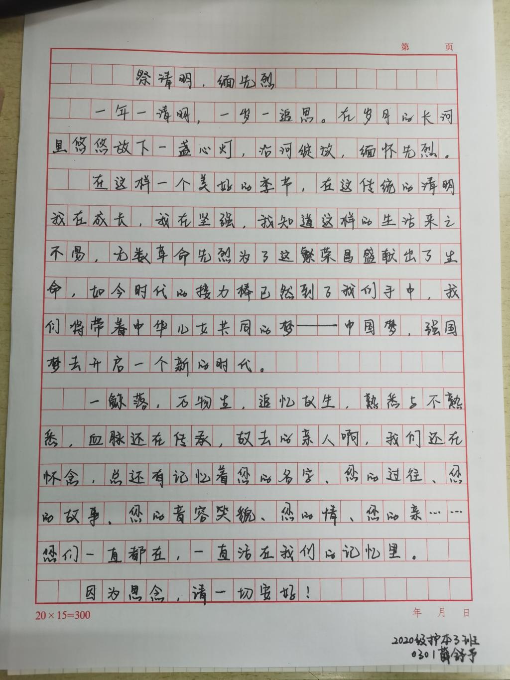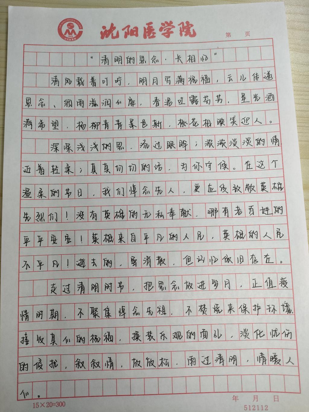 为号召同学们时刻铭记革命先烈为解放国家和民族而不惜牺牲生命的英勇事迹,向烈士们学习顽强拼搏、艰辛奋斗的精神,培养学生的爱国情怀,近日,护理学院开展以“清明的思念·长相忆”为主题的征文活动,同学们积极报名参加。