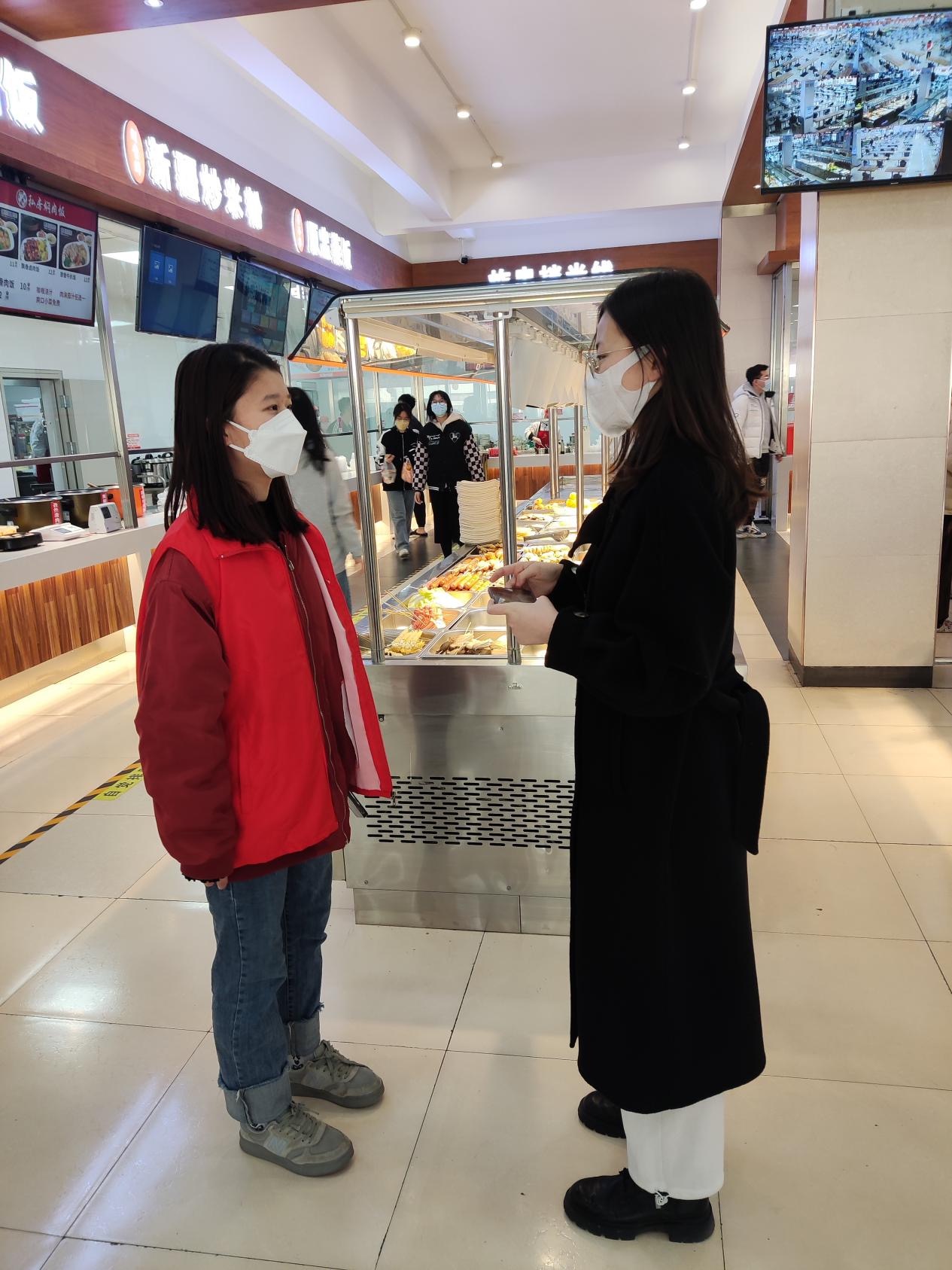在团委开会下达指令后,王乐涵同学立刻返回寝室整理会议重点,及时通过腾讯会议对本组同学进行培训,并传达学校领导与同学共同度过抗疫难关的决心。在排班过程中她充分考虑到各位同学的实际情况,尽量避免一直早班或一直在室外执勤等情况。巡查中,身为组长,王乐涵同学反复与组员一对一沟通交流,强调要点,定期发放志愿者服及口罩,力求做好秩序维护工作。在初春天气寒冷的情况下,她参加了送水志愿队,为在外站岗的志愿者做好后勤服务。