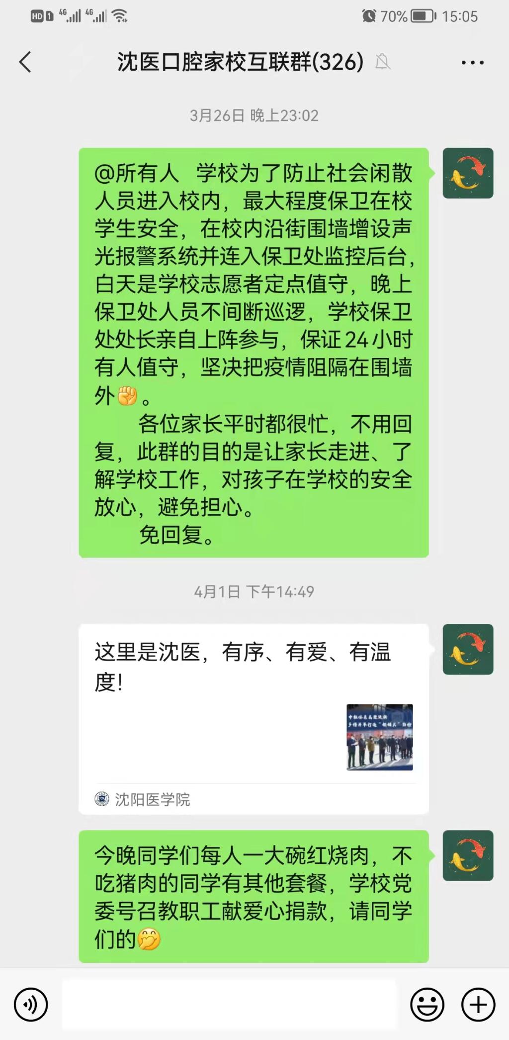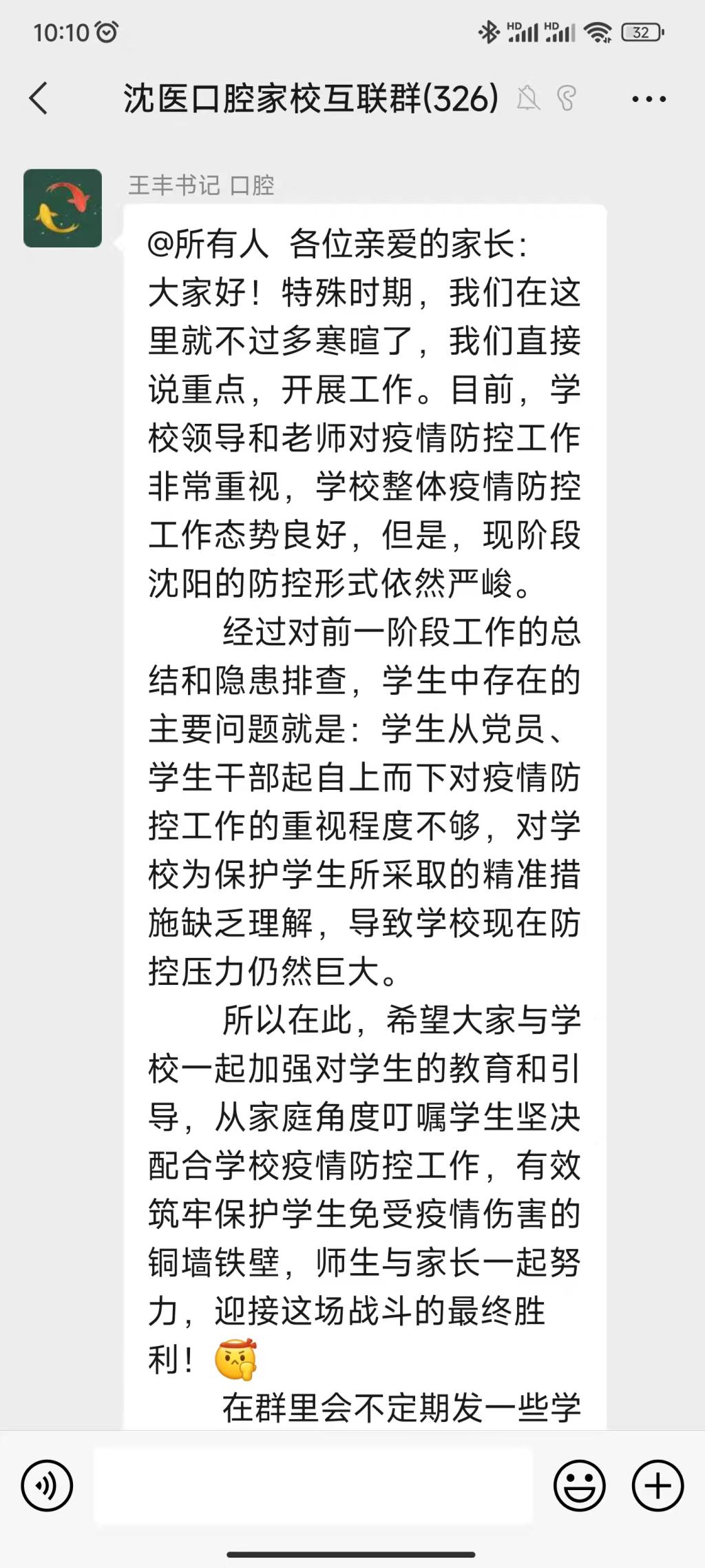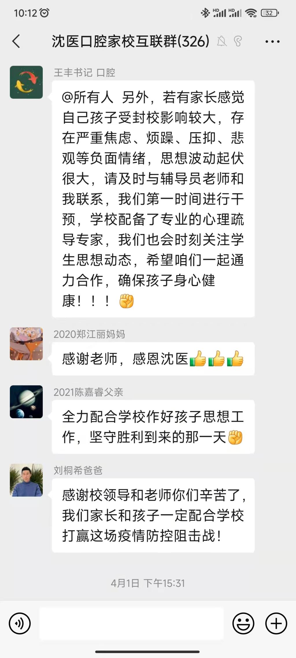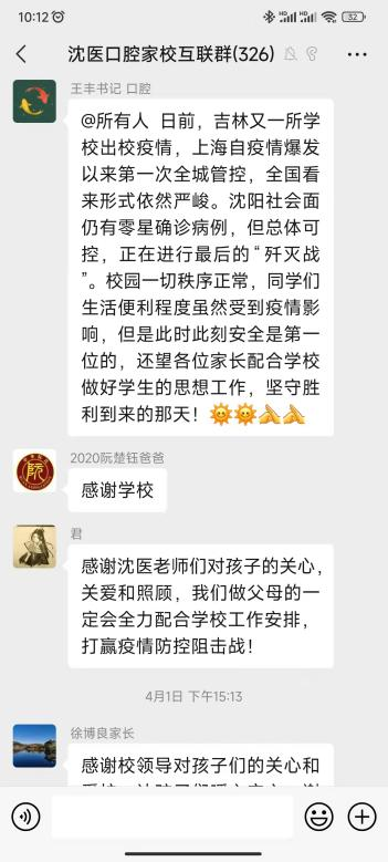 为切实做好疫情防控校园封闭管理期间学生的思想政治教育工作,更好地发挥家校教育合力,家校携手共同筑牢学生生命健康安全防线,口腔医学院建立了“沈医口腔家校互联群”,及时向学生家长通报学校疫情防控相关工作情况,让家长们放心、安心、暖心。