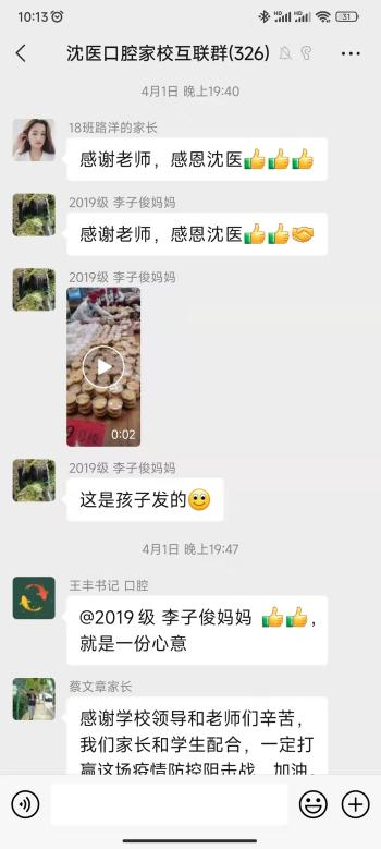 在“沈医口腔家校互联群”里,家长们通过了解学校打造的“铁桶式”疫情防控墙后感到了放心,透过直播看到学校有力的后勤保障后感到了安心,通过子女口中了解学校为学生推出一系列关爱优惠活动后感到了暖心。