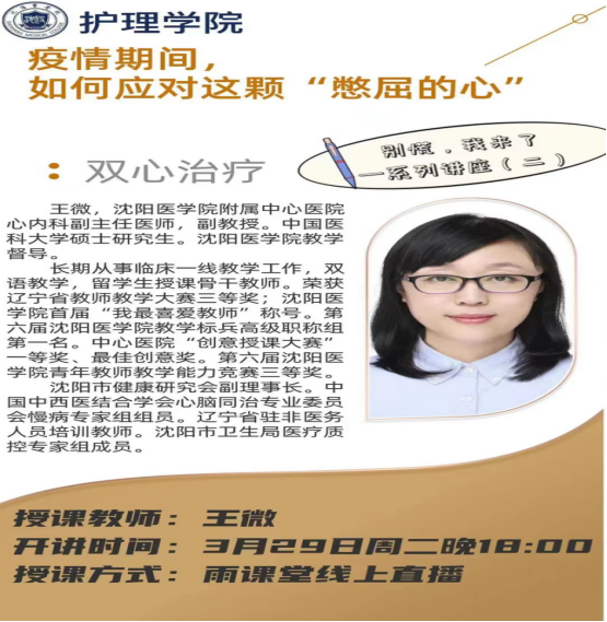 第一期邀请的是护理学院专任教师、精神医学专业博士徐庆怡,针对疫情封校期间生活节奏的改变从心理上如何应对进行讲解,受到学生的一致好评。