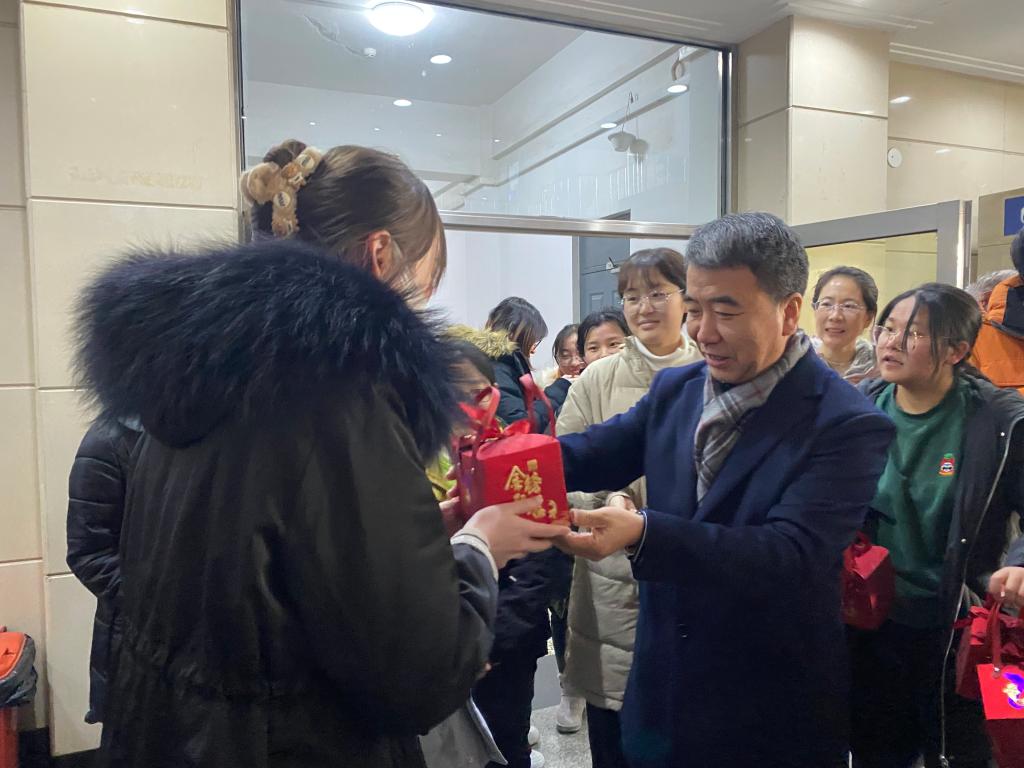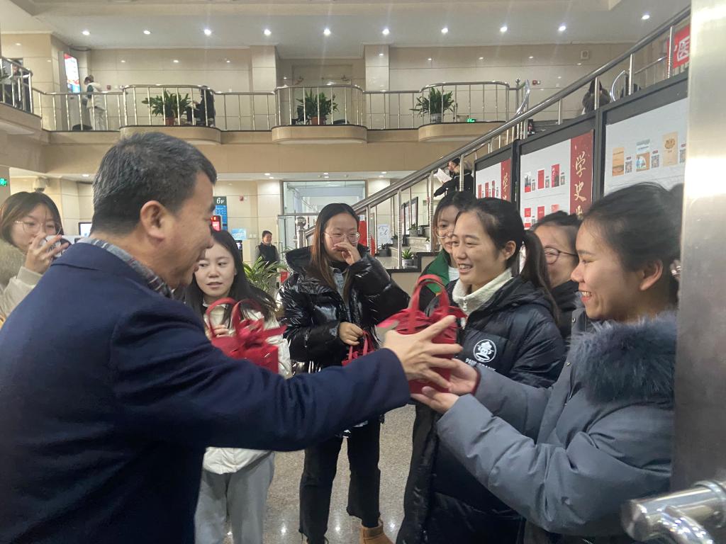 随后,学院领导与辅导员为每位学生分发考研助力礼盒。礼盒由学院师生亲手包装,内装有脐橙,凝聚着对考生金榜题名、心想事“橙”的殷殷祝福。同学们备受鼓舞,纷纷表示一定会牢记叮嘱,坚持到底,竭尽全力认真备考,为自己拼一个好未来,用优异的成绩回报老师和学校。
