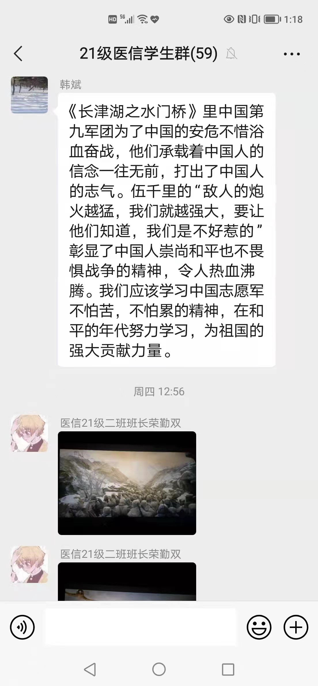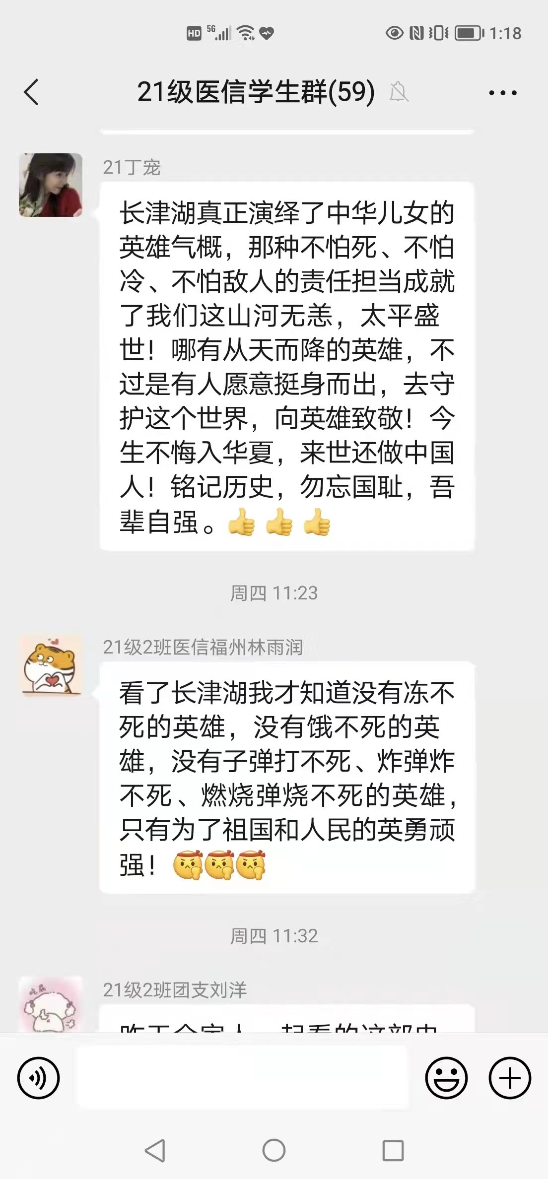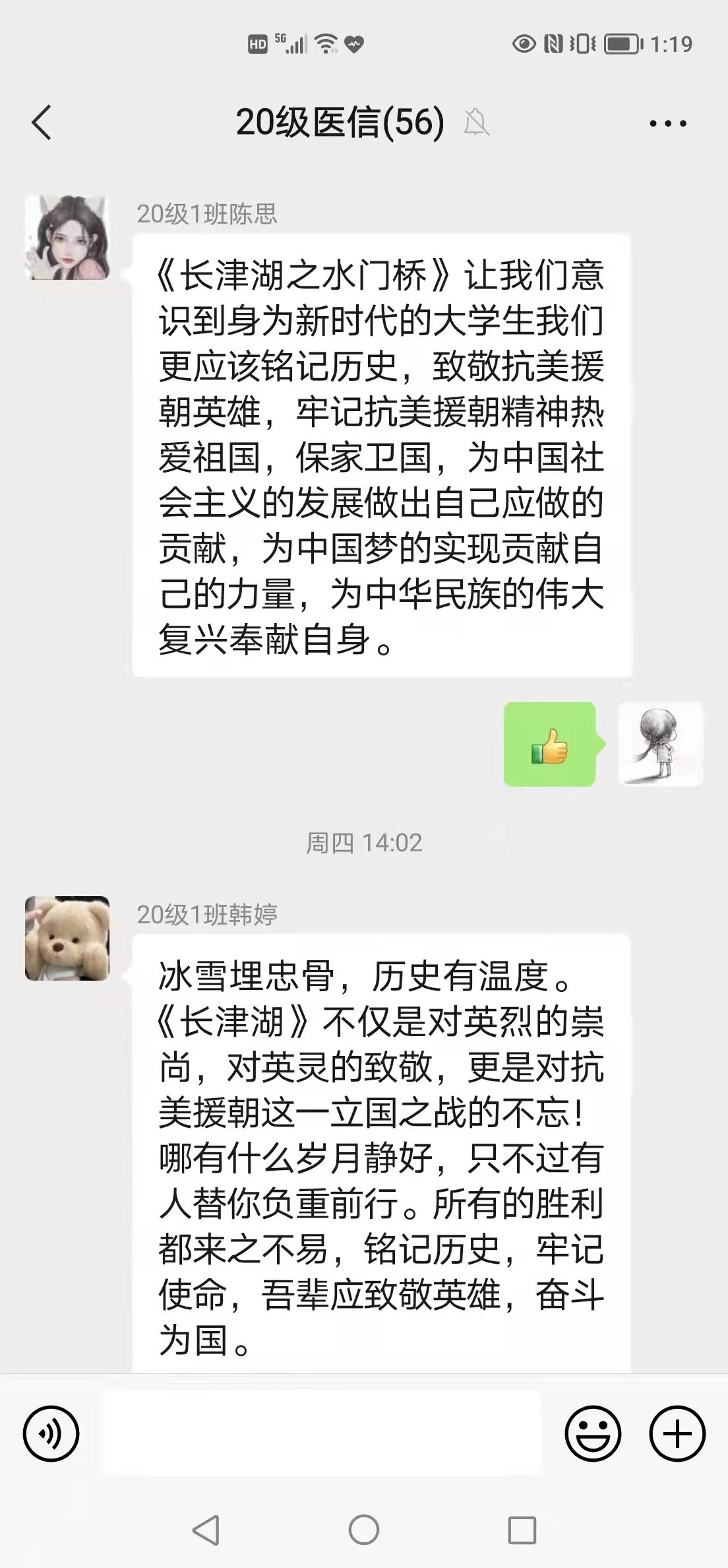 观影结束后,学生们自发地在班级群里写下了感言。学生们表示,要“铭记历史,珍爱和平”,继承和发扬先辈们的爱国主义精神,让美好的青春在实现中华民族伟大复兴这一梦想的征程中绽放光彩,用行动践行“请党放心,强国有我”的庄严承诺。