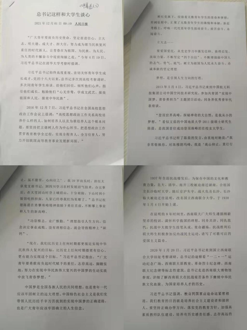 杨威书记说,作为00后的大学生,要牢记党和国家对青年学生的殷切期盼,肩负历史使命,立大志、明大德、成大才、担大任,刻苦专研,学好专业知识,时刻保持昂扬斗志,奋发有为,积极进取。杨威书记向同学们推荐了《平易近人—习近平的语言力量》这本书,希望同学们利用寒假时间广泛阅读红色经典,赓续红色基因。同时,为了让同学们深刻学习本次思政课内容,还将课程内容复印后装订成册分发给每位学生。