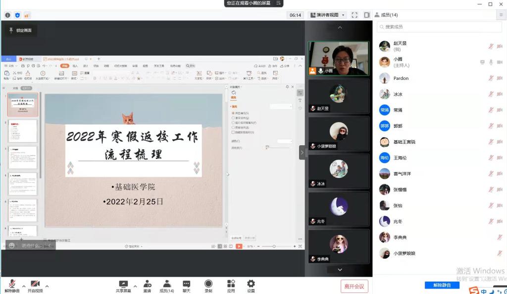 基础医学院把问题隐患想在前,准备工作干在前。为保证学生顺利返校,2月25日,基础医学院学生科科长袁源以线上会议的方式为全体辅导员梳理本次返校流程,要求严把“入口关”,强调辅导员必须严格审核学生的返校申请,排查学生是否有重点关注地区的旅居史,最大程度避免学生有在中高风险区的行程,减少安全隐患。