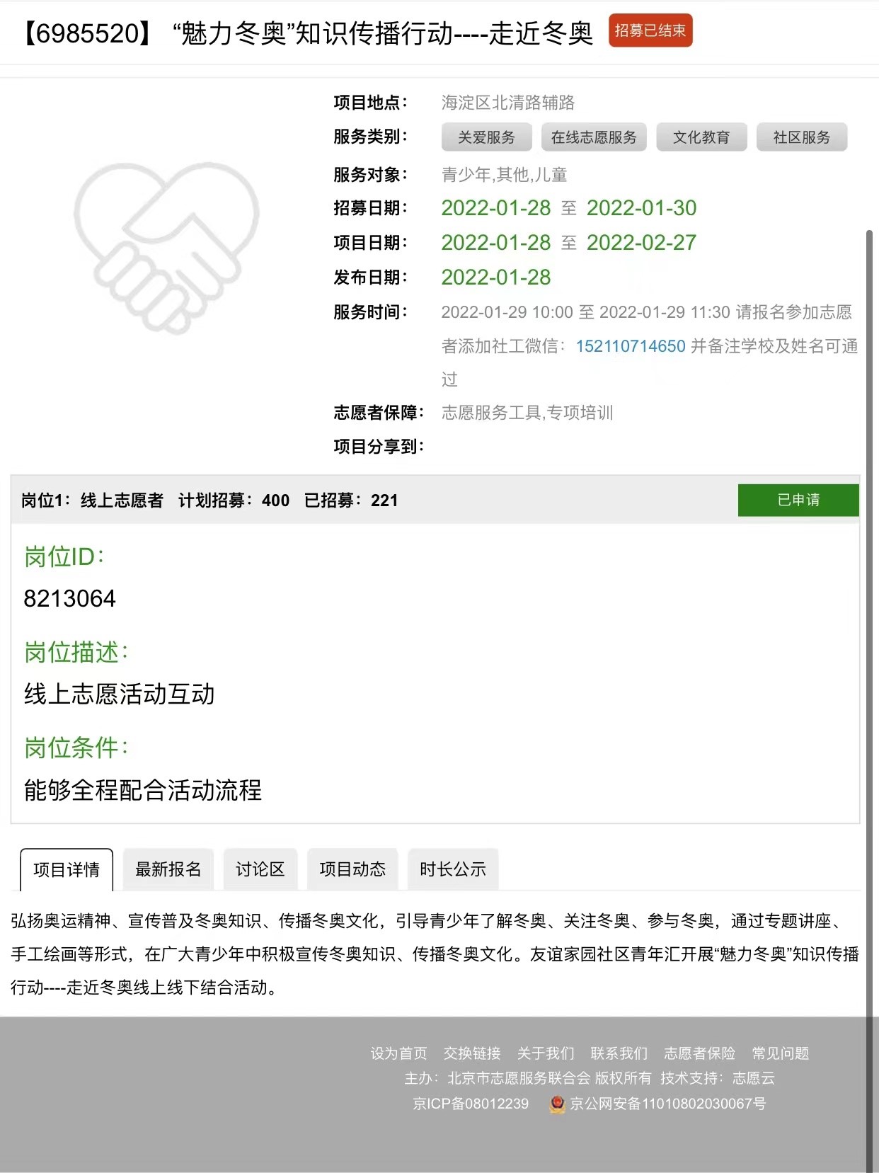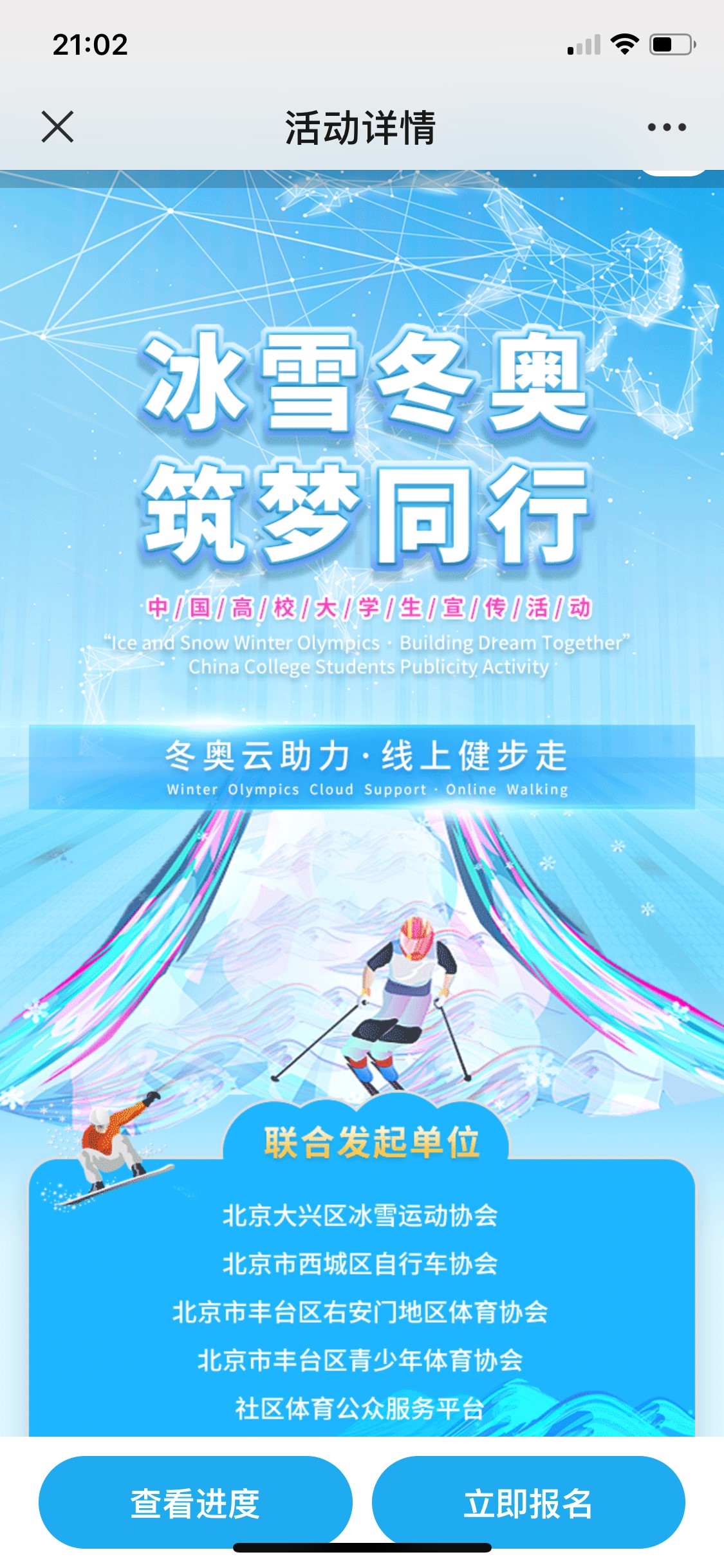 为弘扬奥运精神,推广冰雪运动,宣传冬奥文化,响应“三亿人参与冰雪运动”的号召,医学信息工程学院党总支部依托网络载体,组织学生参与“魅力冬奥——北京冬奥宣传志愿者培训”在线志愿服务、“冰雪冬奥——筑梦同行”中国高校大学生冬奥云助力线上健步走等活动,引导学生关注冬奥、参与冬奥、服务冬奥。