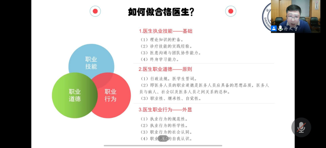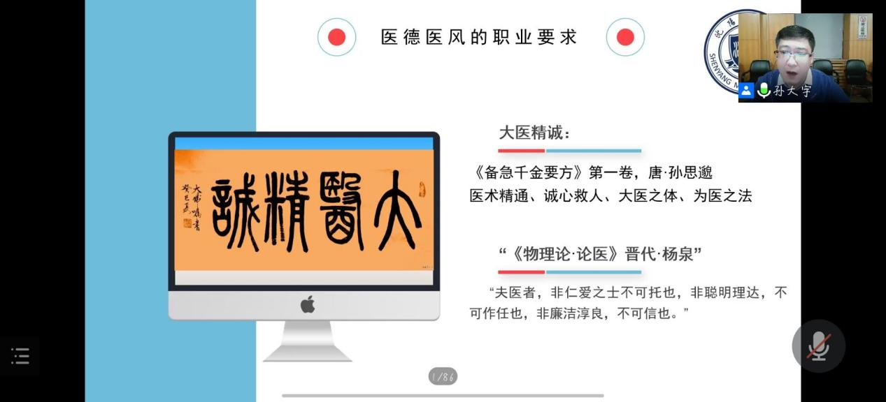 为了进一步加强2021级新生对医患关系的正确认识,树立良好医德医风,11月22日,基础医学院于线上举办了第二十期《医德大讲堂》,中医药学院副院长孙大宇老师受邀担任此次活动的主讲人。