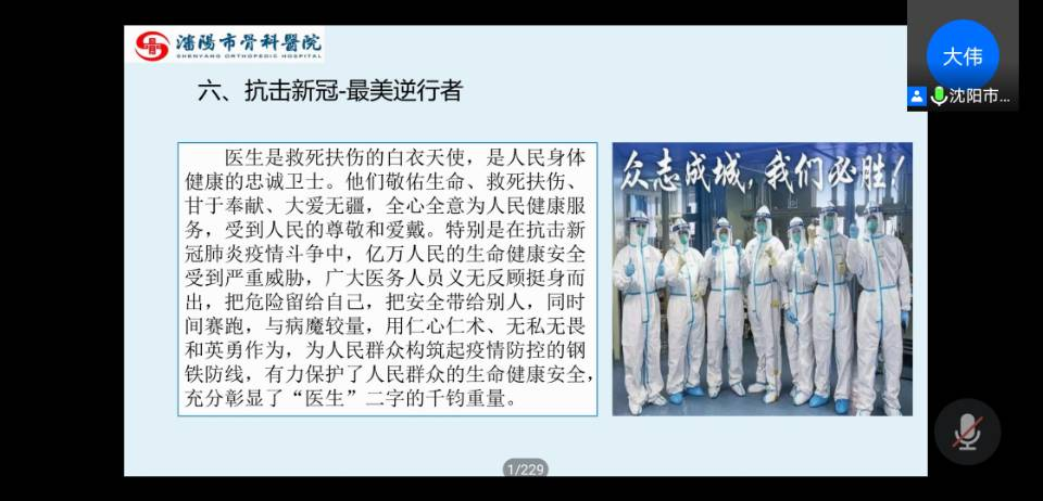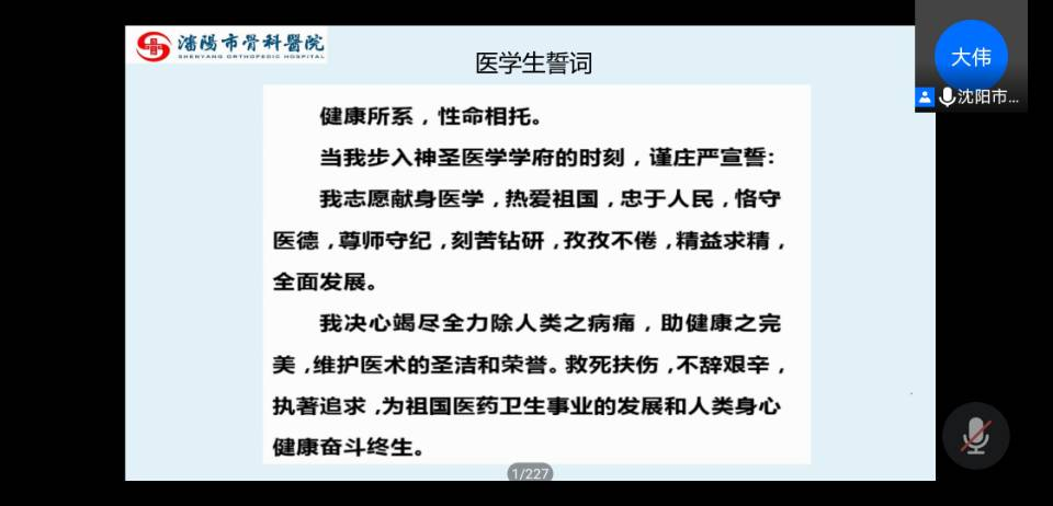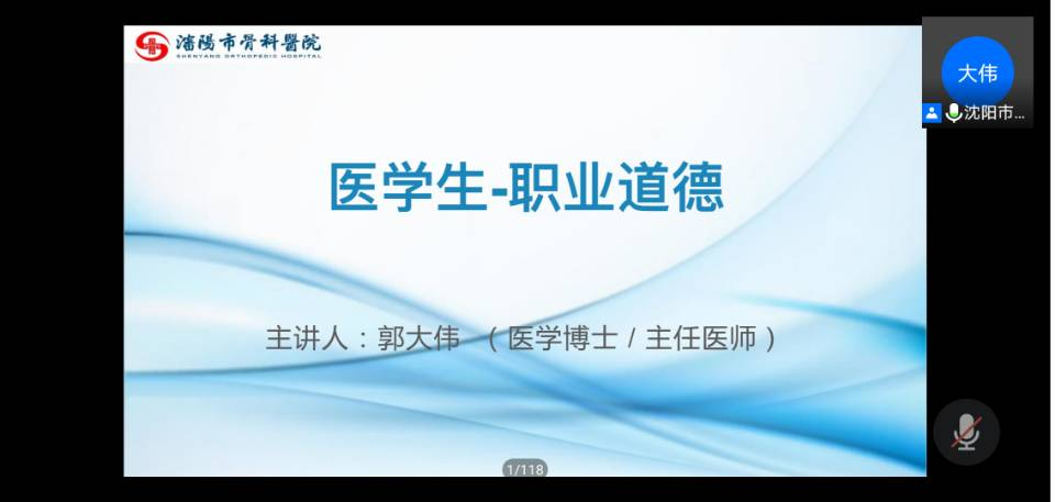 为进一步增强学生医德修养,激发学生投身医疗卫生事业热情,加强医德医风建设,12月10日,基础医学院线上举办第二十一期《医徳大讲堂》,沈阳市骨科医院浑南分院院长、运动医学科主任郭大伟受邀担任主讲人。