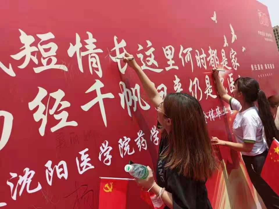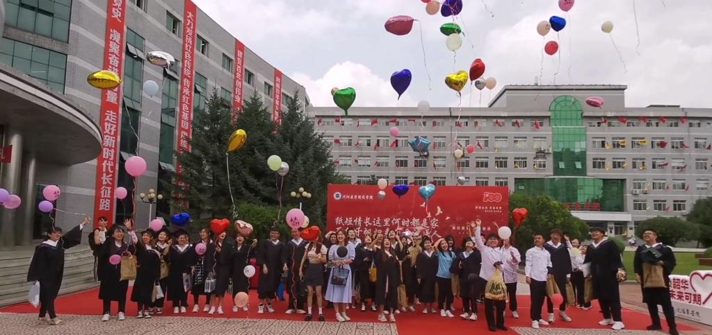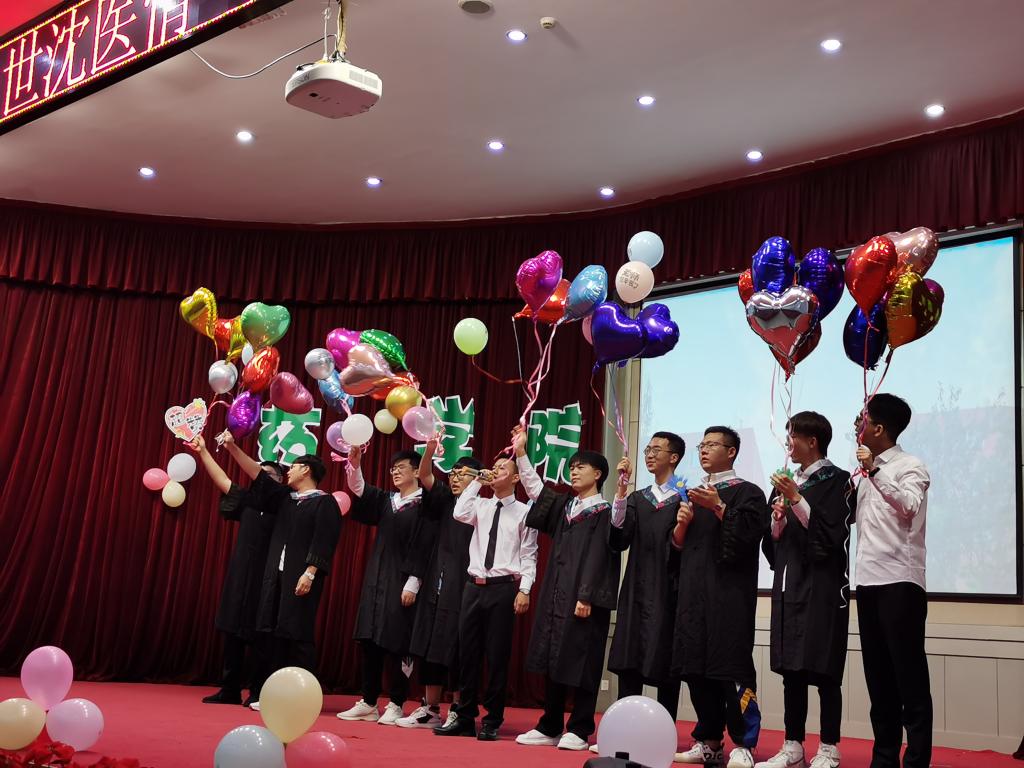 典礼最后,全体教师起立为毕业生送行,同学们热泪盈眶,纷纷与老师致谢、拥抱,毕业生们在图书馆门前放飞了象征理想的气球,并表示要在未来的工作岗位上,一定努力进取,为沈医争光添彩!