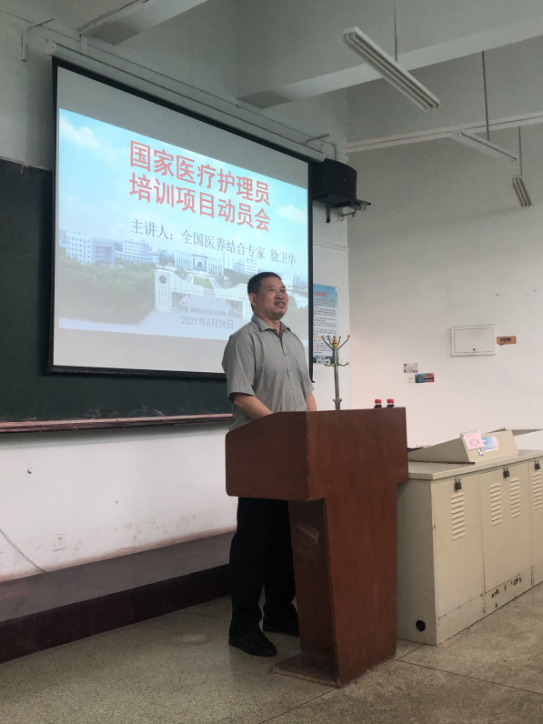6月28日,在第一教学楼J101教室,继续教育学院组织召开了国家《医疗护理员》培训项目动员会,邀请全国医养结合专家徐卫华主任为来自护理学院、附属卫校和医学应用技术学院的百余名学生作了题为《构建医养康养相结合的健康支撑体系》的专题讲座。会议由继续教育学院党总支书记董为主持。
