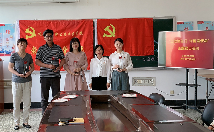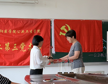 6月20日,公共卫生学院教工第三党支部为四名党龄从10年至22年的党员同志集体庆贺“政治生日”。公共卫生学院学院党总支部委员、副院长裴秀丛为四名党员颁发生日纪念奖杯、赠送政治生日贺卡。
