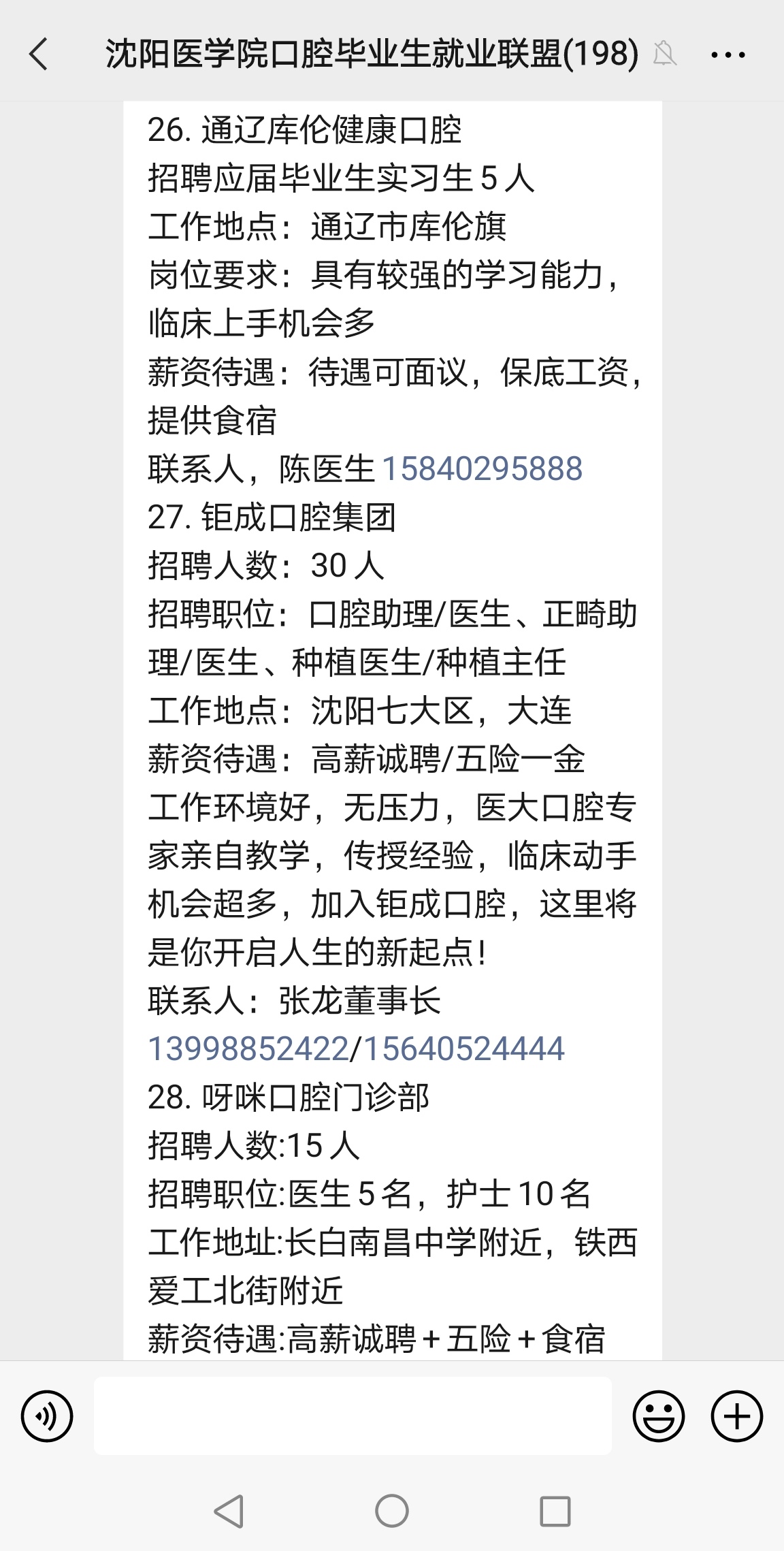 同时,为解决用人单位和毕业生信息资源不对等的情况,学院创建了毕业生就业联盟微信群,通过实践教学基地、口腔校友群等平台,先后邀请43家口腔用人单位加入就业联盟,就业区域涵盖了除辽宁以外,江浙沪和吉林、天津、上海等多个省市,目前,有31家用人单位发布了近200个口腔医生就业岗位,有30%以上的毕业生通过就业联盟完成协议签订。