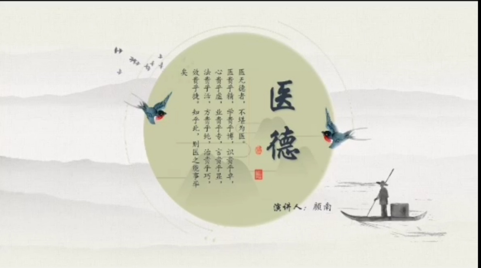 “医无德者,不堪为医。医贵乎精,学贵乎博……”颜南老师首先用一段文言文语句引出主题。她从中国传统医德出发,介绍了中国传统医德的发展,从萌芽时期的“神农尝百草”到发展时期的《皇帝内经》再到完善时期的“医生义务论”,总结出中国古代医生以“仁爱”为核心,以“医乃仁术,医者仁心,济世活人” 为指导的精神实质。