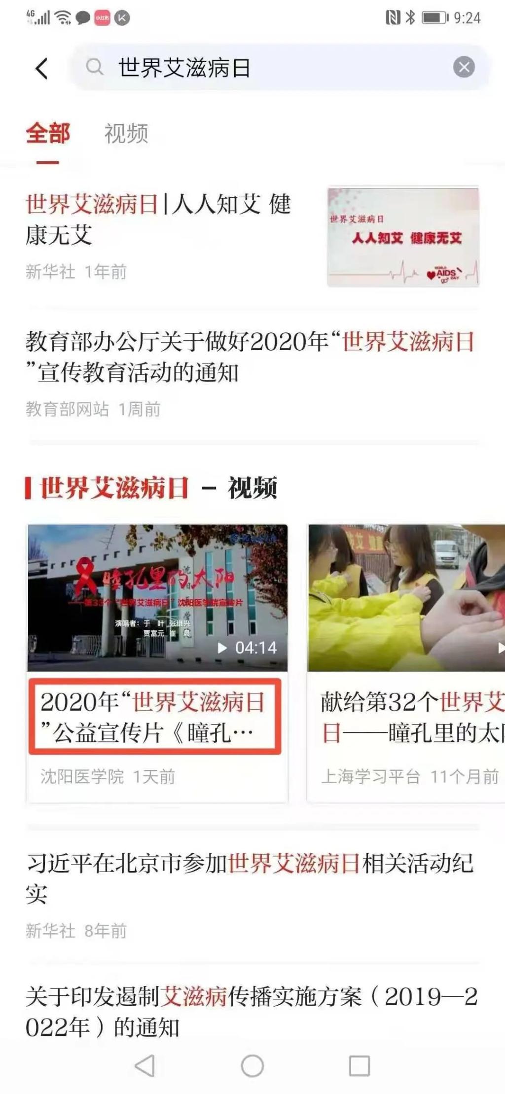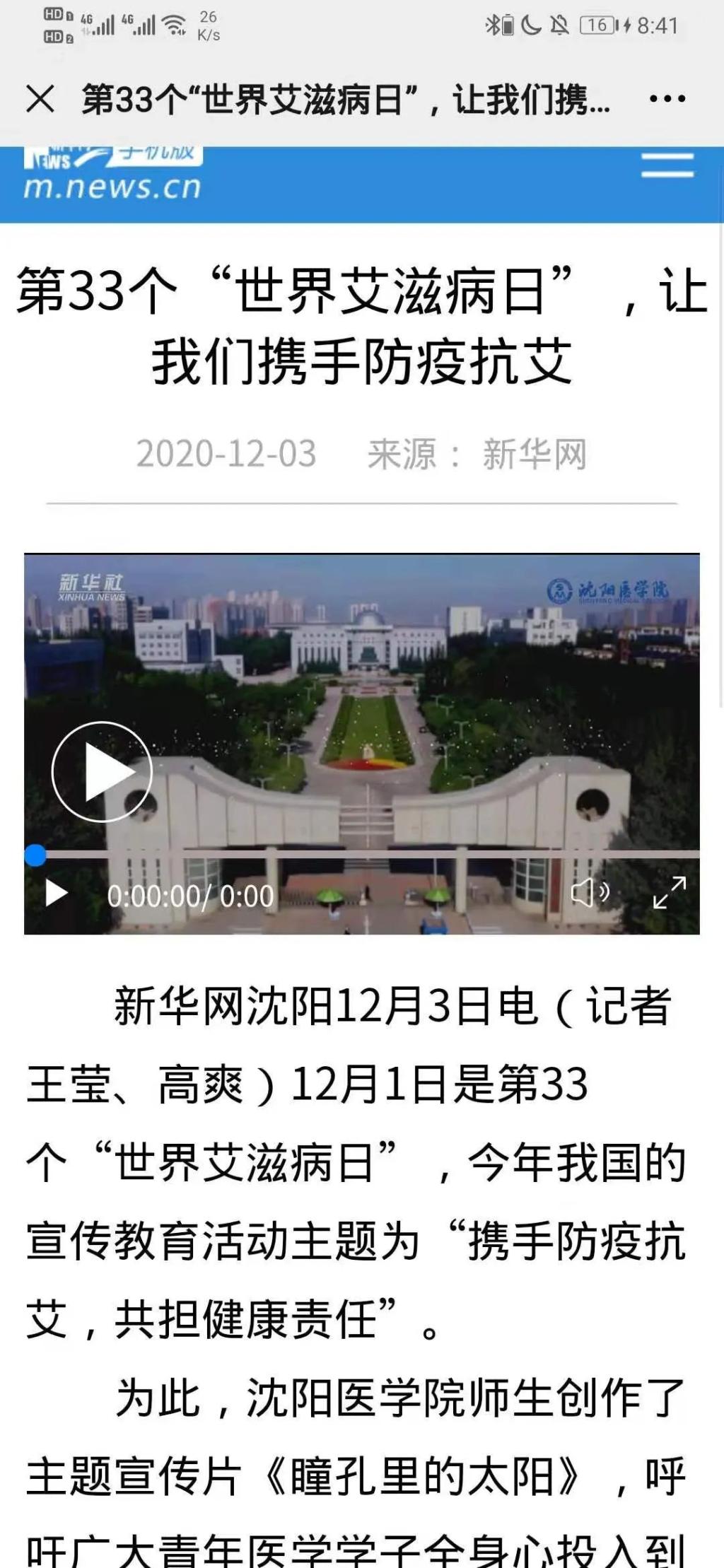 为此,我院公共卫生学院师生创作了主题宣传片《瞳孔里的太阳》,学习强国主平台、新华网、云盛京选播我院公共卫生学院抗艾主题活动宣传片《瞳孔里的太阳》。