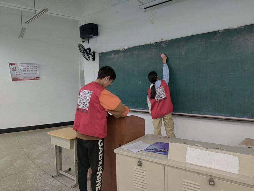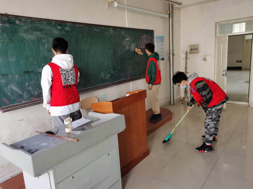 同学们积极响应号召,在校园中开展义务劳动。教学楼内,同学们在教室中开展卫生大扫除:擦黑板、整理讲桌、清扫地面、清除卫生死角。在生活区和操场上,学生们拾起各条路上的垃圾,对校园环境进行清理。学院给所有班级划分校园分担区,明确责任范围。