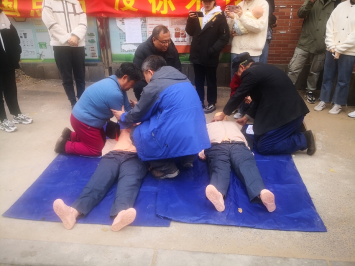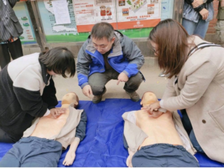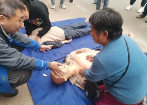 本次活动从室内走到室外,面向更多居民普及医学急救知识。在实践操作环节,居民们兴致勃勃、兴趣浓厚,纷纷上前学习急救操作方法。教师和学生志愿者分步骤进行详细讲解,纠正错误动作,对居民的操作逐一指导。期间,学生志愿者还向居民们发放心肺复苏术、海姆立克急救法等科普传单,让更多居民了解日常急救知识。