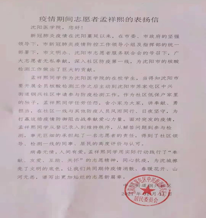 2021年1月11日米兰milan官方网站药学院学工党支部收到了沈阳市苏家屯区中兴街道铜兴社区居委会发来的感谢信,对孟祥熙同学在全民核酸检测中的优秀表现给予了肯定和表扬。