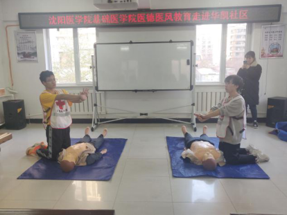 在宝合社区,生理教研室杨智航老师借助人体模型为社区居民细致地介绍了海姆立克急救法;在华凯社区,宣讲团的青年学生以人体模型模拟急救对象,为社区居民进行专业的心肺复苏术急救演示,分步骤进行详细讲解。
