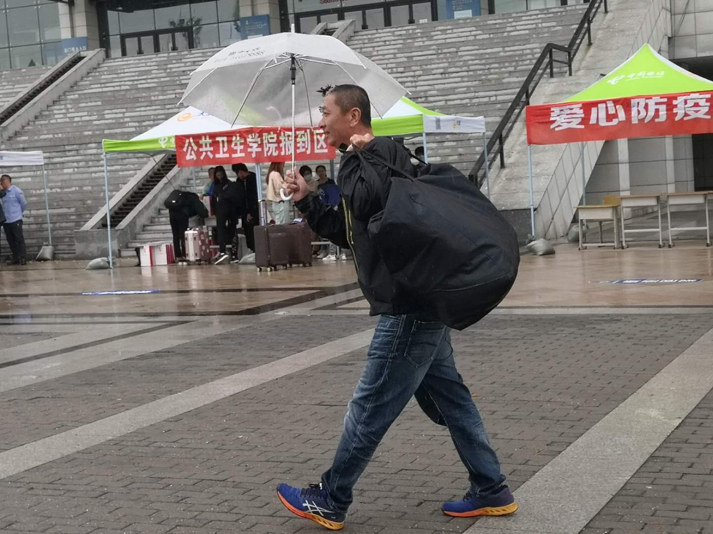 9月9日的雨中,有一位特别的“家长”格外引人注目,只见他满面笑容,一手打着雨伞,一肩背着大包,大步迈向校内负责运送行李的摆渡车。仔细一看,这个“家长”可不简单,竟然是学校车队队长王威师傅。原来在校门口,王威师傅遇到了询问摆渡车位置的返校学生,他二话不说,扛起学生的行李就向摆渡车走,这一幕恰巧被旁边偶然经过的老师拍下了。记者问到王威师傅,他连连摆手说:“千万别报道我,就是遇到咱孩子返校回来搭了一把手,女生拿东西费劲儿,谁遇到都会这么做。”